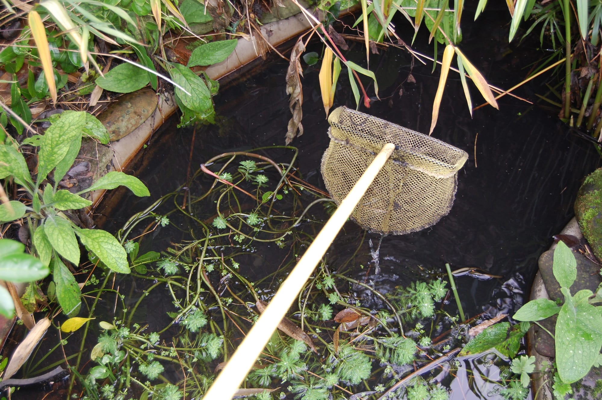 Out of reach, the last pear clings stubbornly to the highest branch. Shall I wait for it to fall? The highest fruit is the sweetest, so better pick it now. Beneath it, our little pond makes a ladder-proof barrier. Perhaps I can just reach it with the fishing net we use for clearing pond-weed?