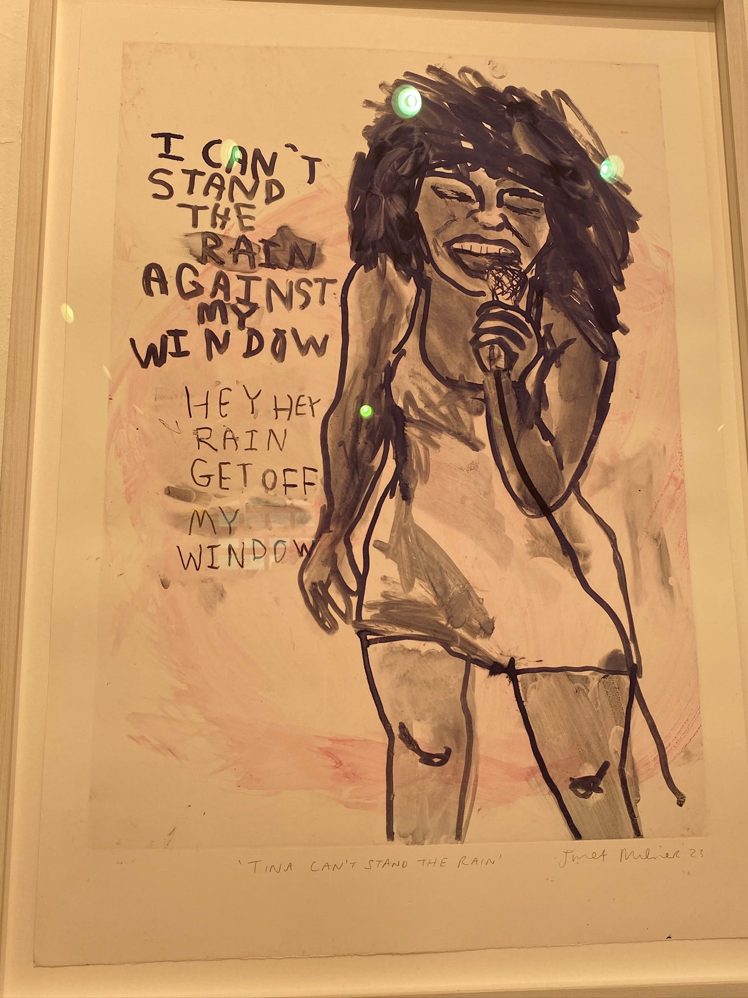 The exhibition is always curated so that everything can be shown to its best, so artists and makers are not necessarily placed together. Karen explained that there needs to be “a conversation” between the 3D and 2D. Showing downstairs are some wonderful ceramics by Judith Douglas and woven vessels by Julie Gurr, with Annabel Faraday's ceramics complementing Janet Milner's 'Tina Can't Stand the Rain'.