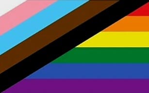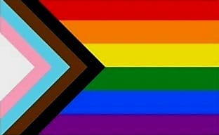 The 2018 Progress Pride flag by Daniel Quasar. This flag was designed to bring focus on inclusion and progress within the community. It includes black, brown, light blue, light pink and white. These colours represent marginalised people of colour, the trans community and those living with or lost to HIV and AIDS.