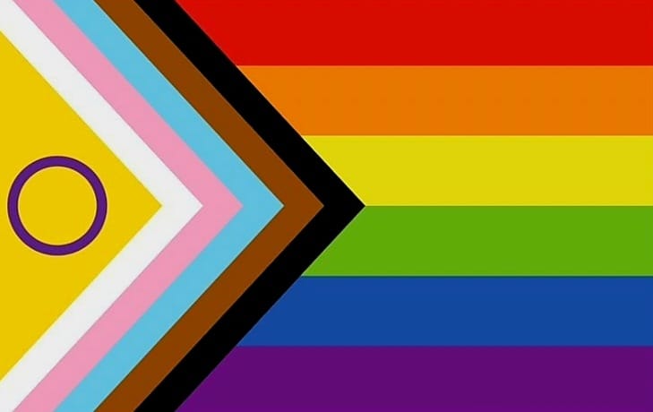 The 2021 intersex-inclusive redesign of the Progress Pride flag by Valentino Vecchietti. It raises awareness to the wider community, about where intersex sits within the LGBTQIA+ sexualities and gender identities.