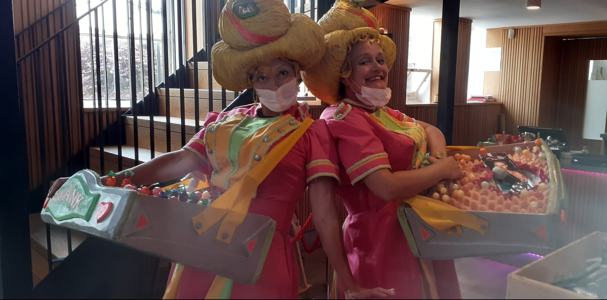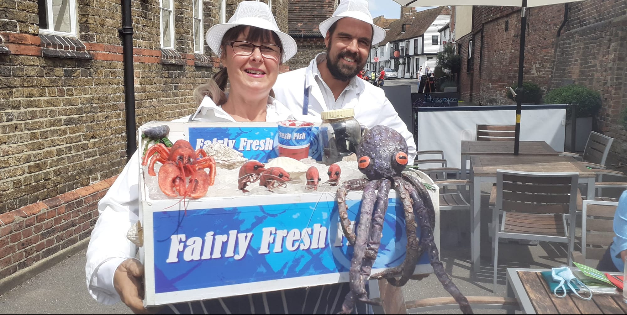 Before they appeared, two women, dressed as puddings, with trays meandered amongst the tables showing their wares and another group carried a tray with plastic seafood, crabs and lobster, asking guests to do a high five with the tentacles of an octopus. The performances created a great atmosphere, all entering into the fun of it though not quite sure of the meaning. A surprising, lovely afternoon.
