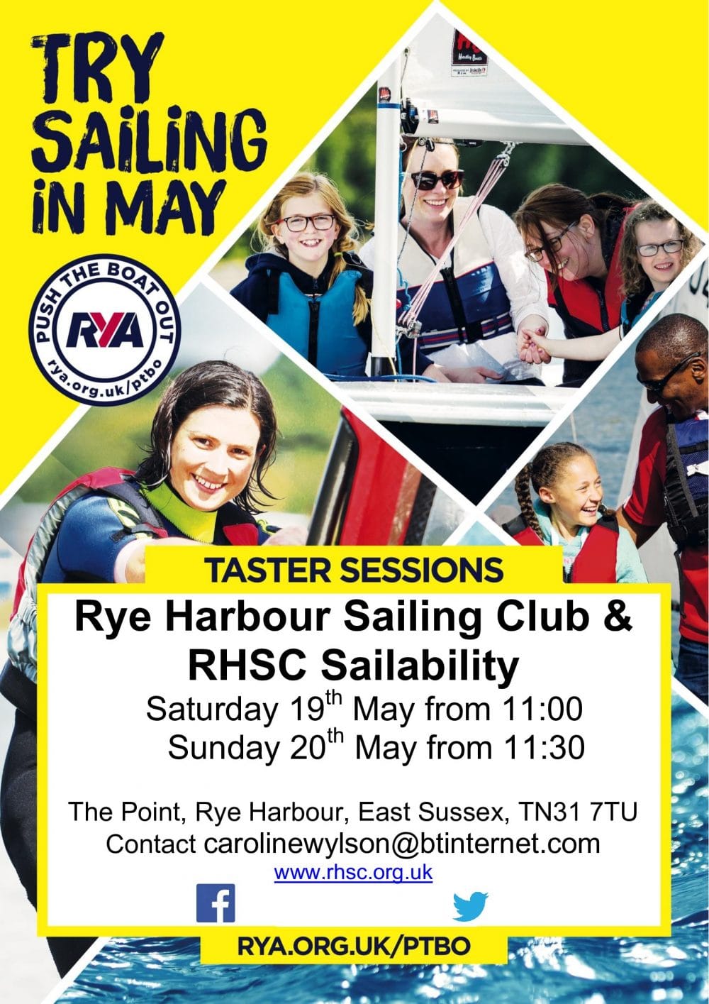 In order to avoid disappointment book in advance by contacting either Richard Hopper (cruiser sailing) at richard@richardhopper.plus.com or Caroline Wylson (Sailability) at carolinewylson@btinternet.com or Simon Marsh at simon@hi-flight.co.uk (dinghy sailing). Or call 01797 223112 for more information. We look forward to seeing you at Rye Harbour Sailing Club, The Point, Rye Harbour.