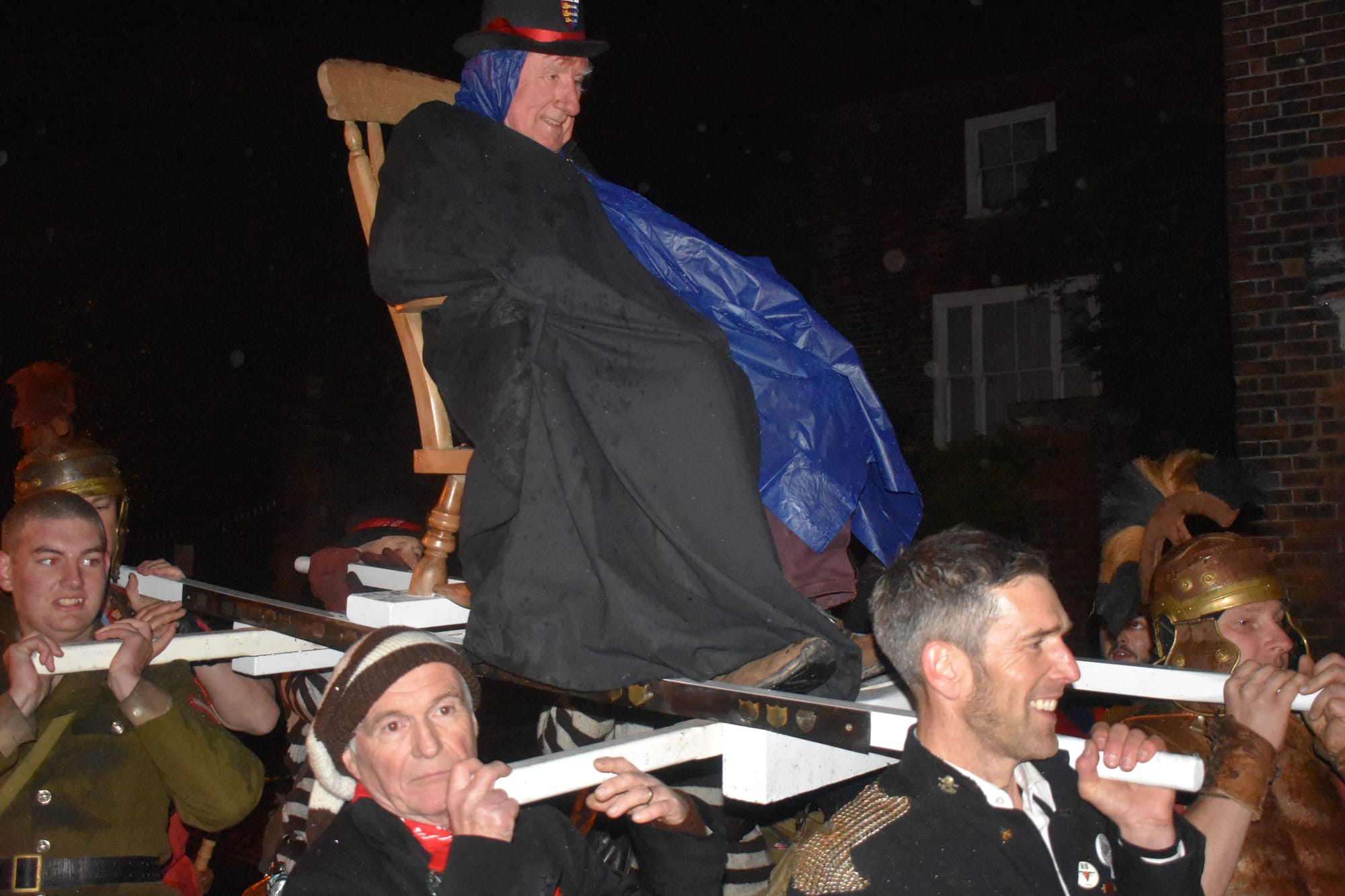 Each year a Ryer is "chaired" down to the bonfire to perform the ceremonial lighting, and this year the honour belonged to Mike Eve. Well known for his contribution to the work of the Rye Arts Festival - of which he is a past chairman - and for his part in the development of the Kino among other enterprises, even he looked a touch anxious as, in the wet and slippery conditions, his chair was hoisted on to the shoulders of some strapping Bonfire Boys for the short trip from the Landgate to the bonfire.
