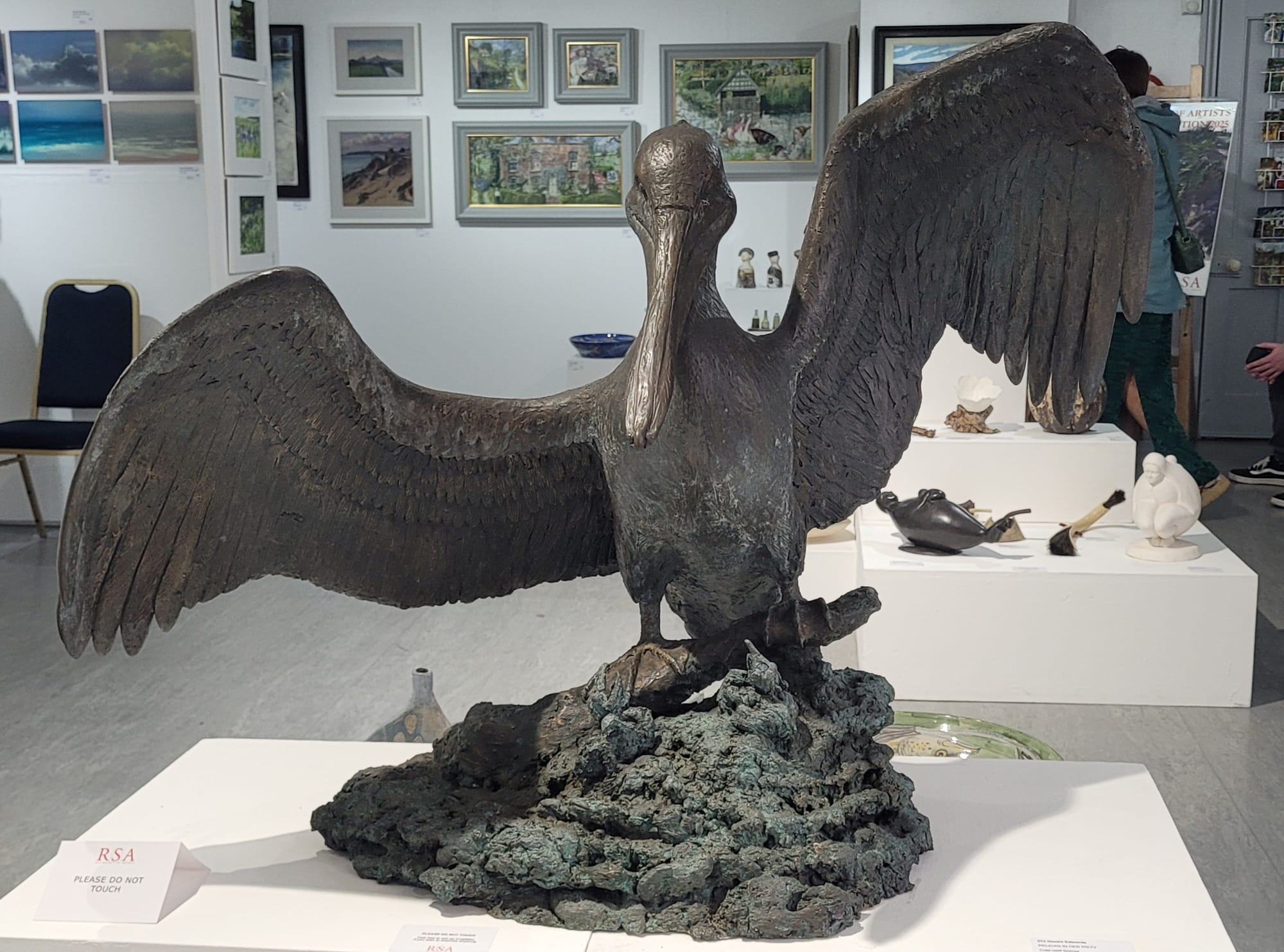 In the centre of the upstairs gallery is a majestic bronze sculpture by artist Naomi Edwards, Pelican in her Piety, the bird, with outstretched wings, protecting her young at her feet. A non-member, Naomi Edwards is a sculptor and mould-maker who also offers casting and finishing services to artists and designers.