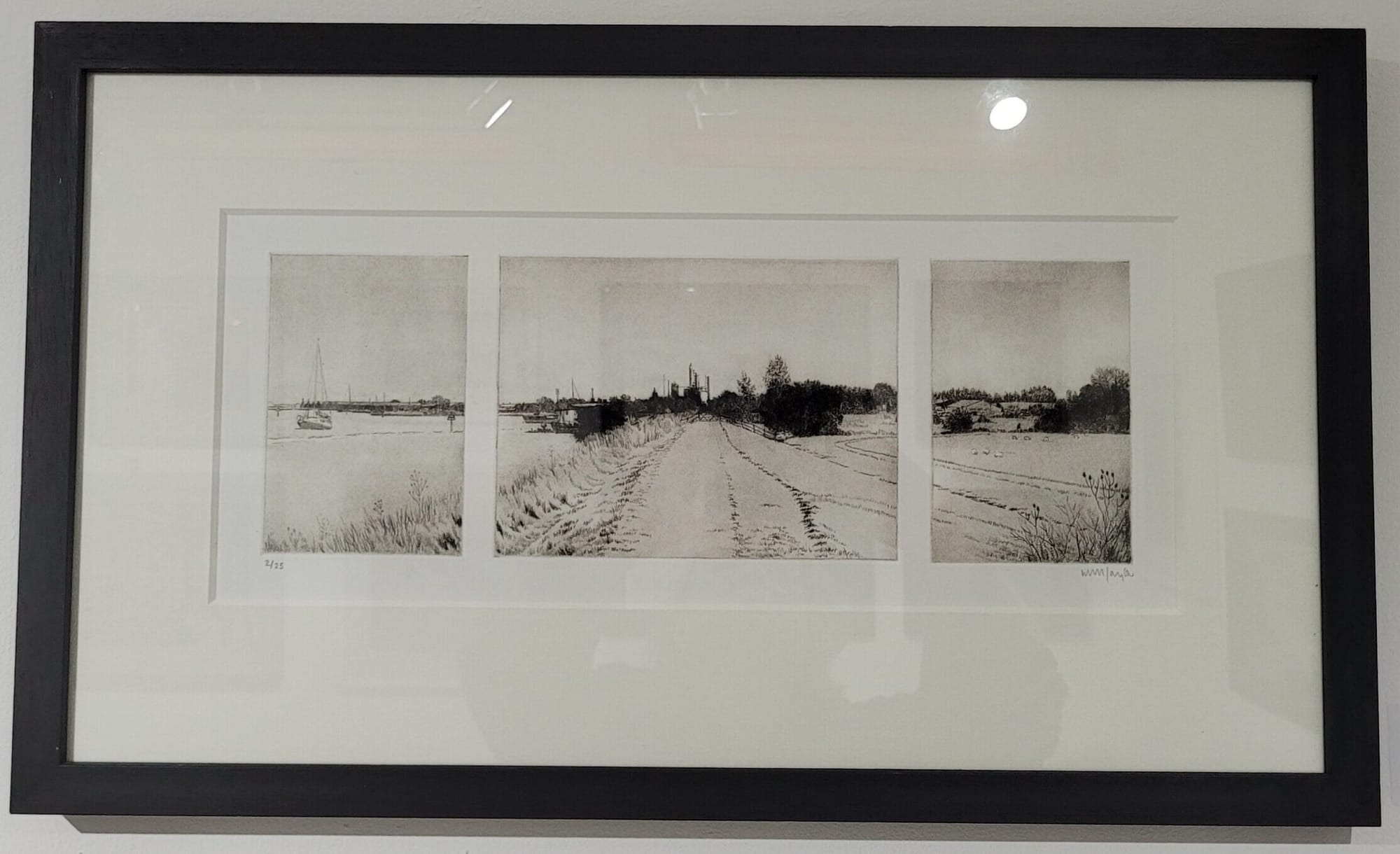There are prints and drawings throughout the show - including etchings, linocuts, monoprints. RSA member, Will Taylor’s prints are delicately detailed and precise. His drypoint Rye Harbour triptych, with a panoramic view from Rye towards Rye Harbour is split into three sections - the Rother, distant chemical works and the field beside the river - the sense of place conveyed through dark silhouetted shapes, fine lines and empty space, reminiscent of Sir Frank Short’s etchings.