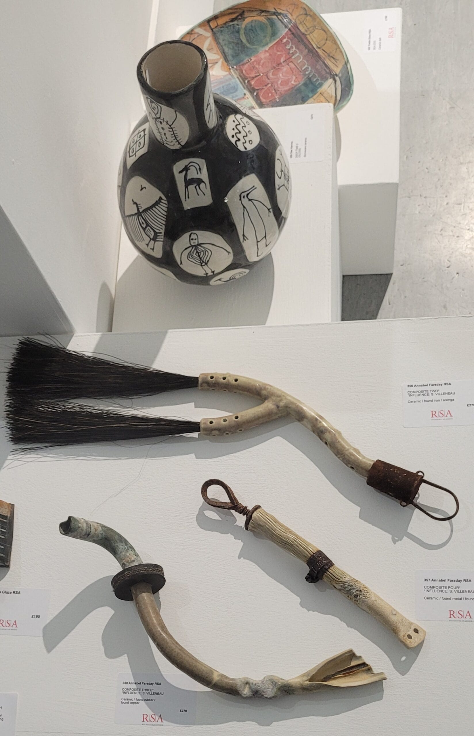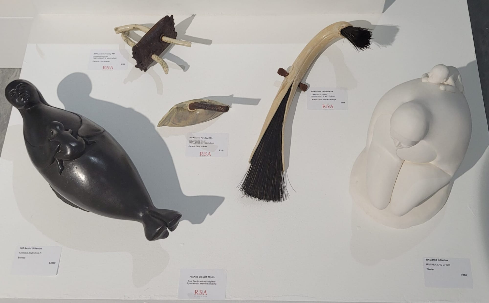 The art is presented beautifully with clever juxtapositions – a vase with neolithic designs by Dee Harvey is placed next to a selection of sculptures by Annabel Faraday looking like primitive tools or decorative objects, alongside Astrid Gillenius’ primitive-inspired plaster and bronze Mother and Child.