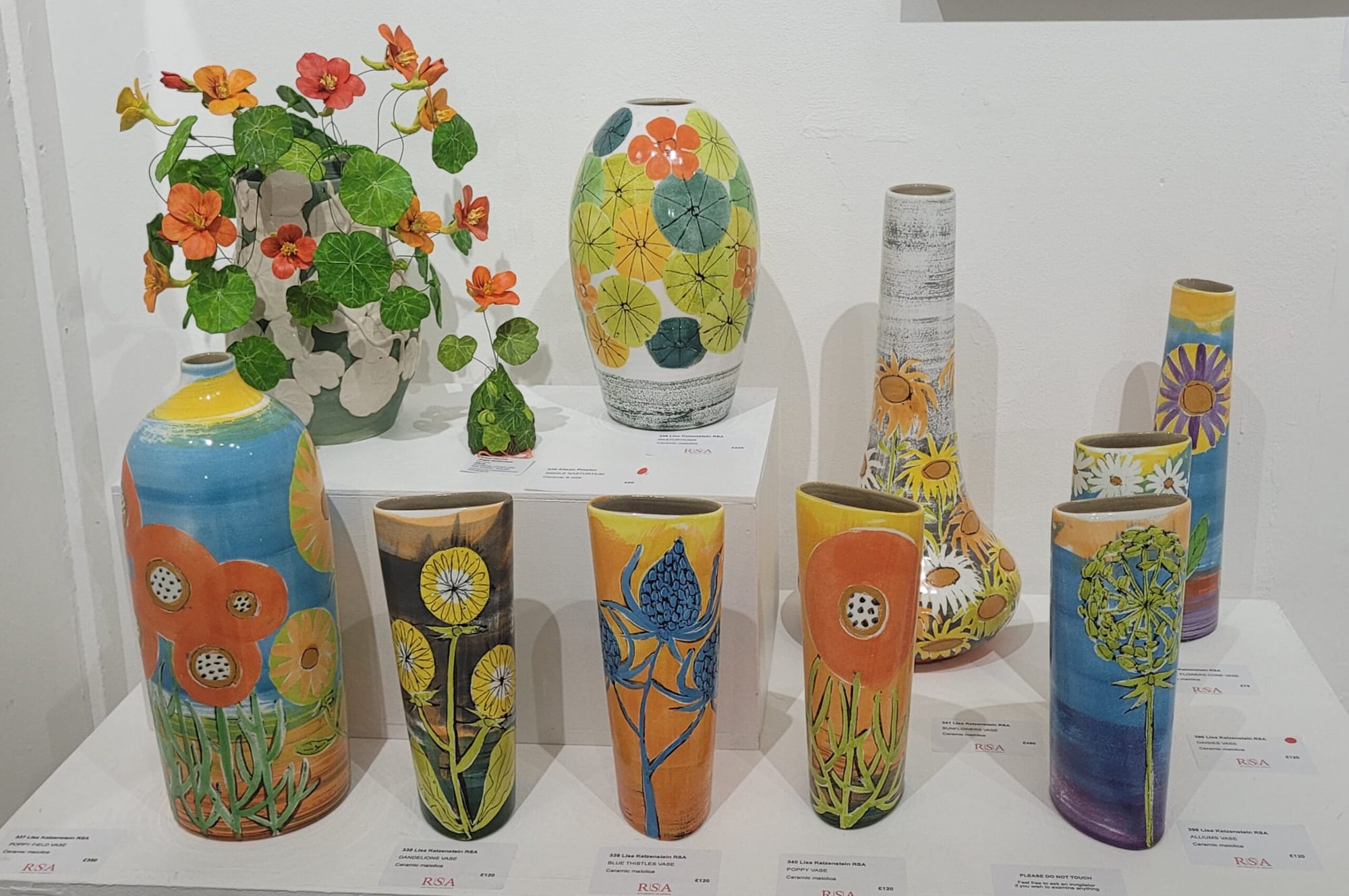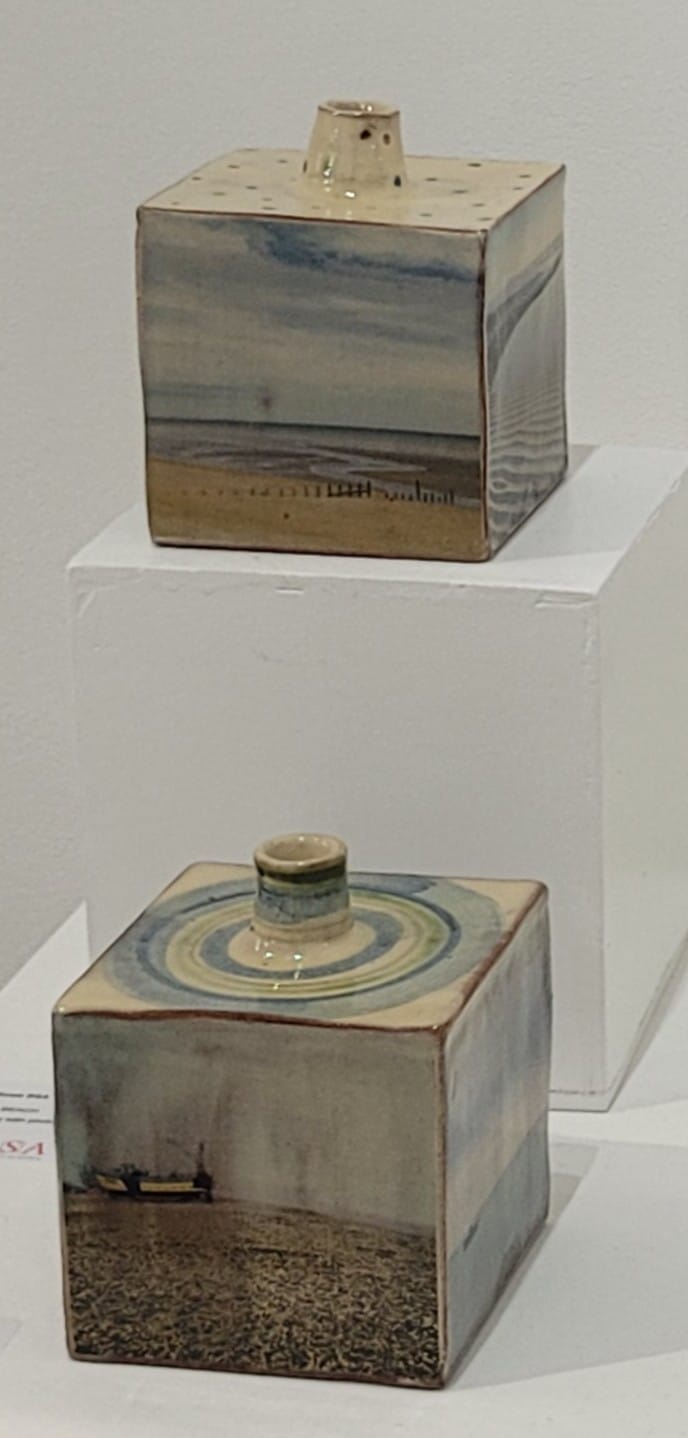 The vases of Lisa Katzenstein and delicate ceramic sculptures of Alison Proctor are grouped together and share the colour and vibrancy of nasturtium flowers and leaves. Davida Smith’s landscape prints, with their horizontal lines and blue tints, hang next to Jenny Pockley’s blue clouds and seascapes oils.