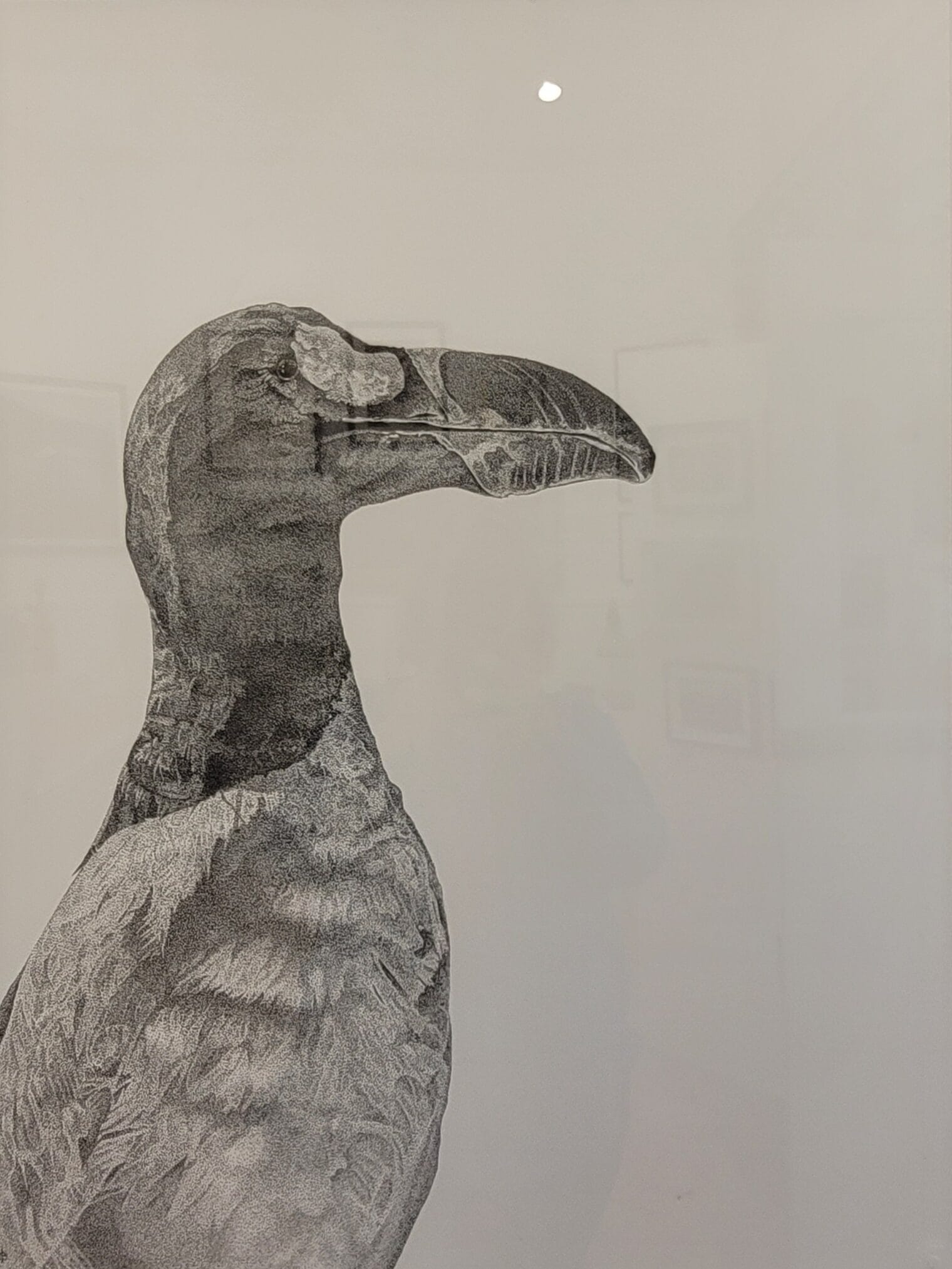 "He made no cry" (Great Auk) by Chris Booth, a technical tour de force, is a stippled drawing using fineliner pen of the now extinct great auk, portrayed with precision and delicacy which took the artist a total of 45 hours over 12 days.