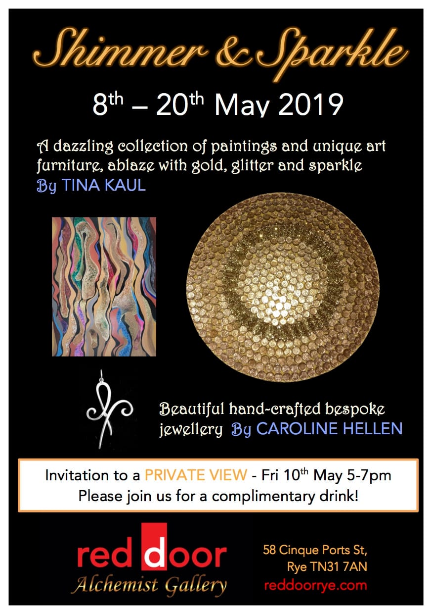 Red Door’s founder, Tina Kaul, will unveil a collection of work infused with metallics, glitter and sparkle, including unique up-cycled art furniture as you’ve never seen before. Joining Tina is local jewellery maker, Caroline Hellen, with a beautiful collection of bespoke hand-made jewellery pieces and sets.