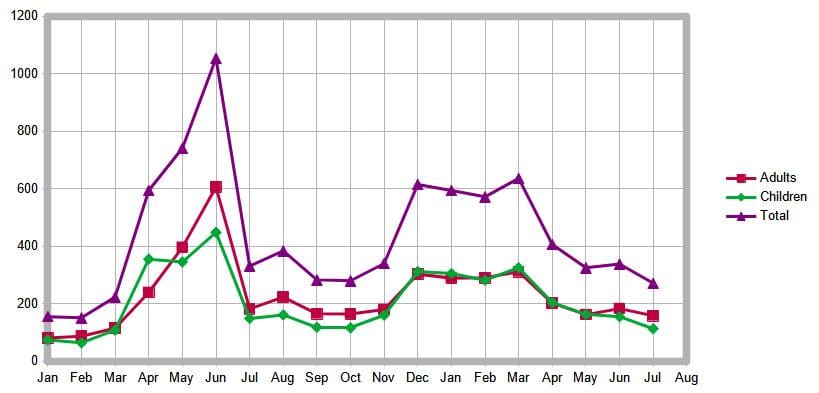 During July, as lockdown restrictions have eased, we are pleased to see that the overall numbers of people in crisis who visit the food bank is reducing. During July for the first time, we have seen the numbers falling to nearer pre-pandemic levels.