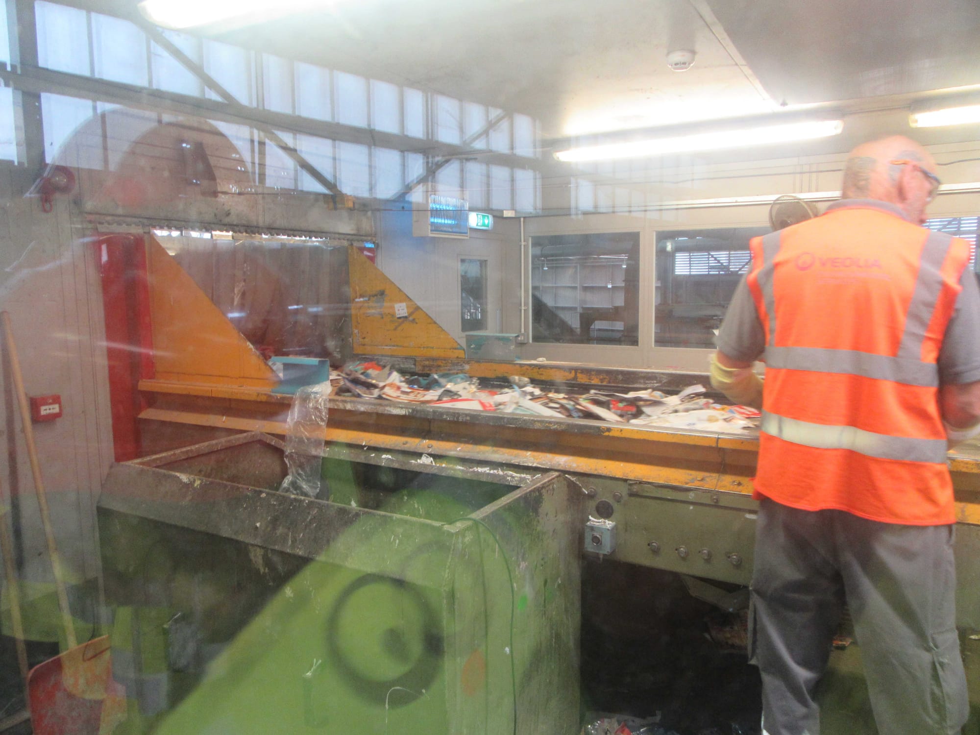 The recyclable waste first goes into a bag splitter, which removes most of the black bags, from there it goes up a conveyor into a pre-sort cabin. One of the most surprising aspects of the visit is how essential sorting by humans is to the process. Two operatives separate out items which should not be there, known as contaminate. This includes polystyrene, glass, plastic pots, tubs and trays and many other items. Amongst the most dangerous contaminates are hypodermic needles, which risk piercing gloves.