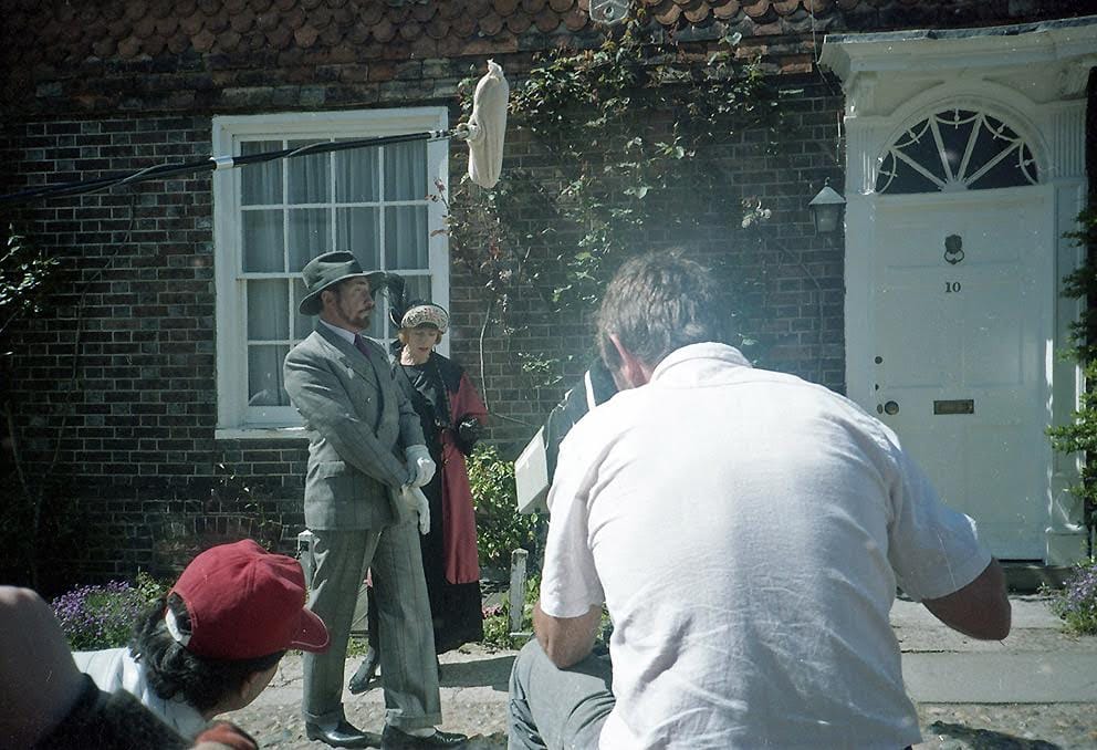 I also recall a crew member chalking on the pavement edge underneath the archway of the house, these chalk marks were to indicate where Major Benjy and Mrs Mapp-Flint should stand briefly before they marched off up the street, after the hasty departure from the doomed dinner party attended by the Duchess of Sheffield. This take, I later discovered, was the very last in the series (“Au Reservoir” episode).