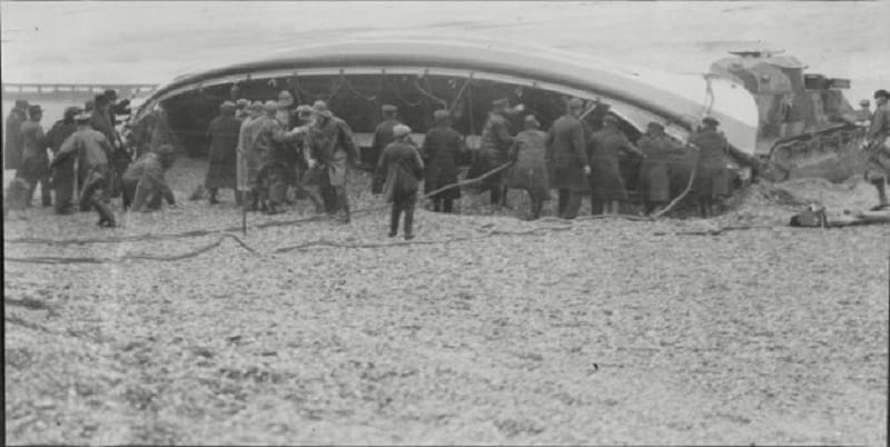 On the fifteenth, early in the morning, the maroons went off to call the crew of the Mary Stanford to the boathouse for a launch to go to the aid of a stricken vessel, the SS Alice, off Dungeness. The lifeboat launched in the teeth of a mighty storm which was to cause the death of all seventeen crew-members. It remains the worst such loss of life in the history of the RNLI.