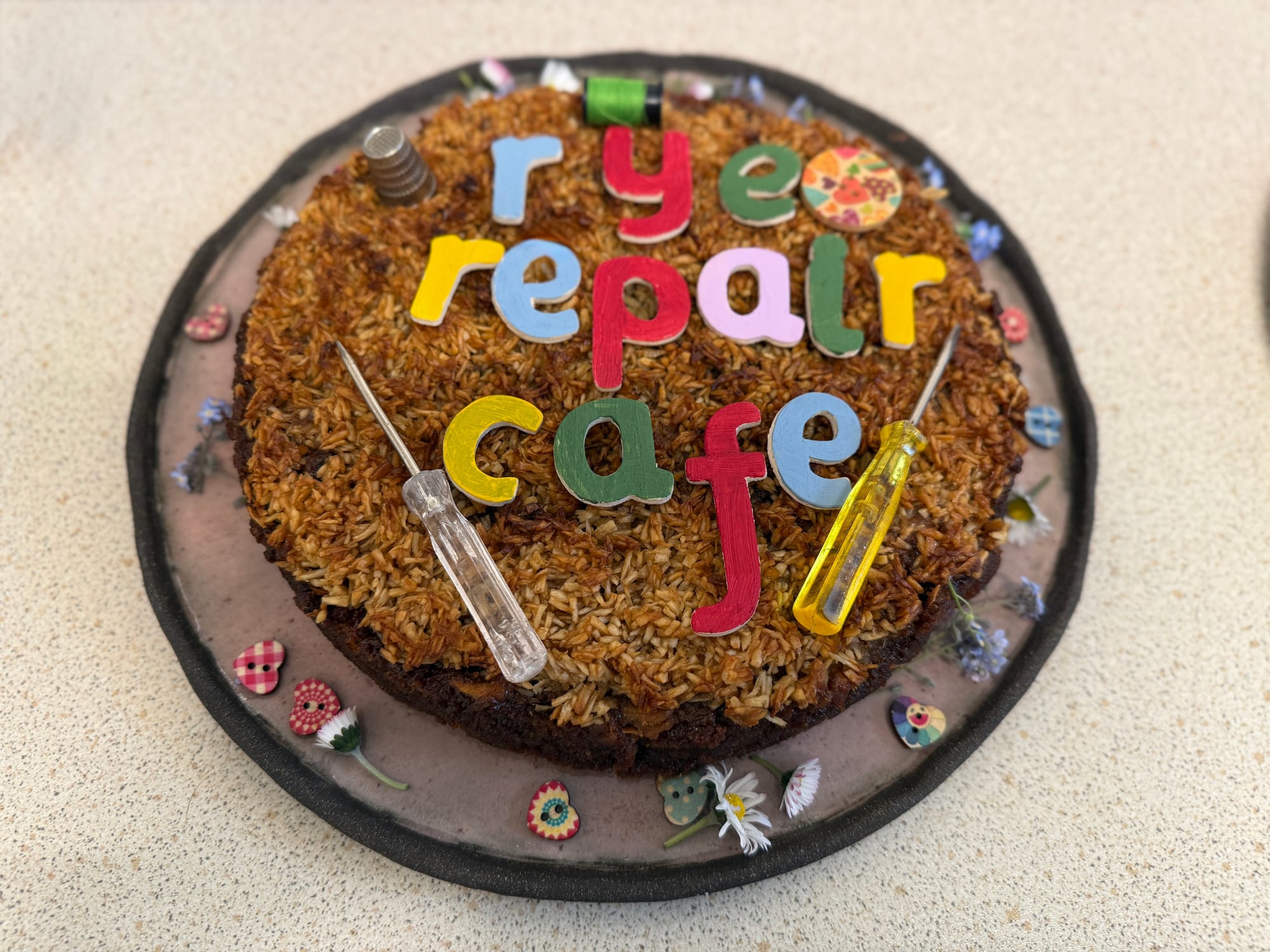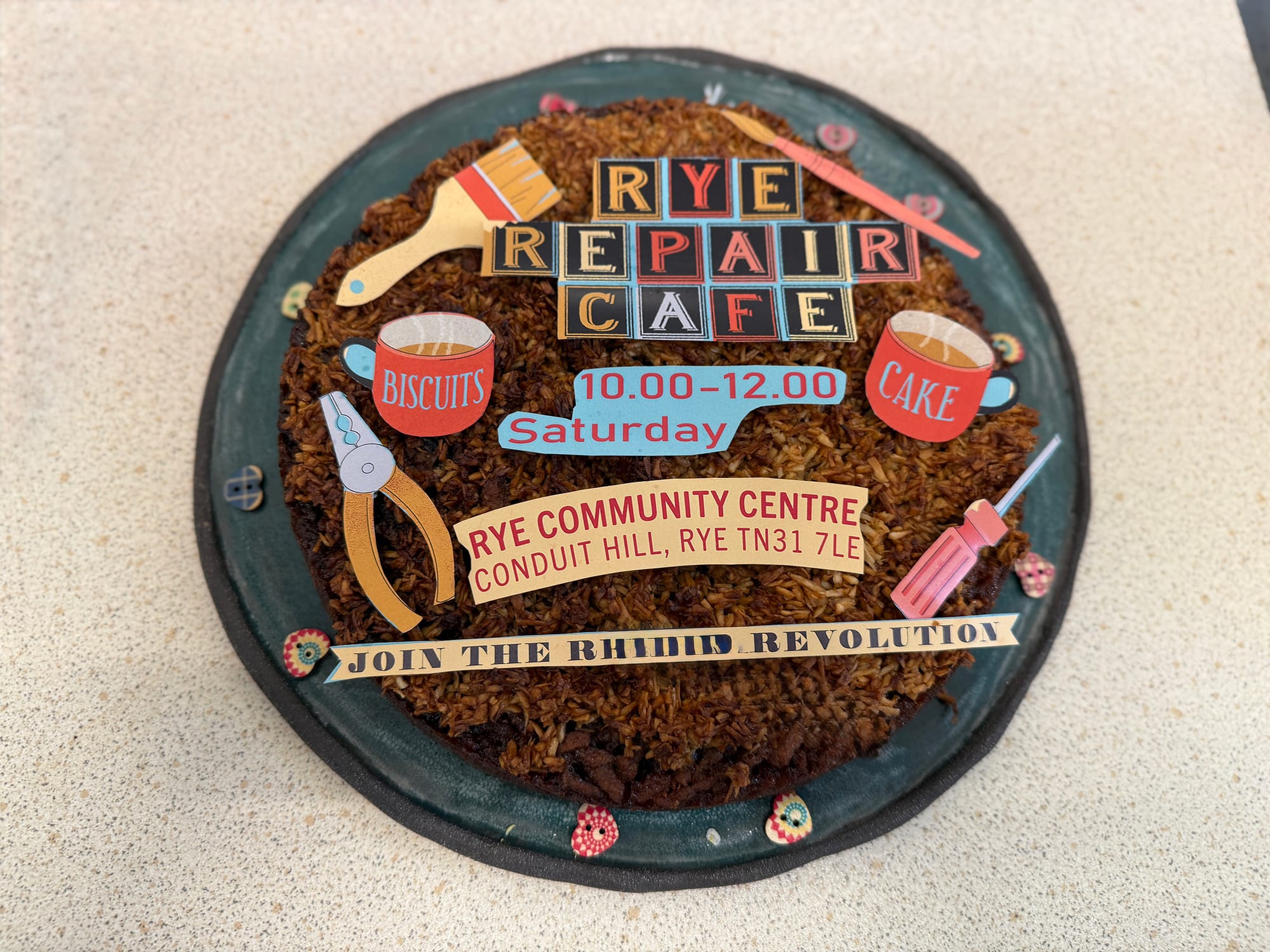 When the Repair Café started a year ago no-one could have predicted just how popular it would become. When the doors open each month there is a steady stream of people clutching items needing repair. Seated at desks around the community centre are the experts in their various fields all waiting to help. While customers wait there is always an array of beautiful home-made cakes and tea and coffee - hence the name Repair Café. This month Jane had made two special cakes to share with the volunteers after the morning session.