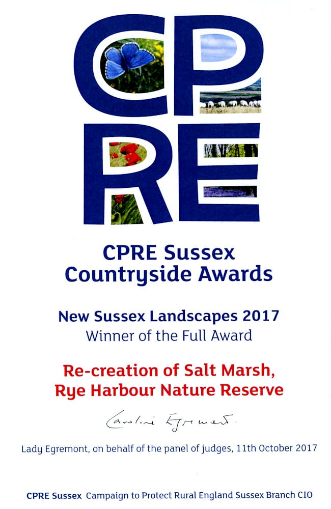 Rye Harbour Nature Reserve (RHNR) has received the Full award in the New Sussex Landscapes category of the CPRE Sussex Countryside Awards 2017.