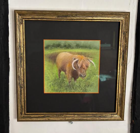 Some weeks later she told us that she had something to show us. On visiting her home in Tilling Green we were ushered towards a tiny light-filled annex at the back of the house. Here, carefully propped and presented, we found an image of our wonderful 900kg bull, Tomag, known affectionately as Mr T.