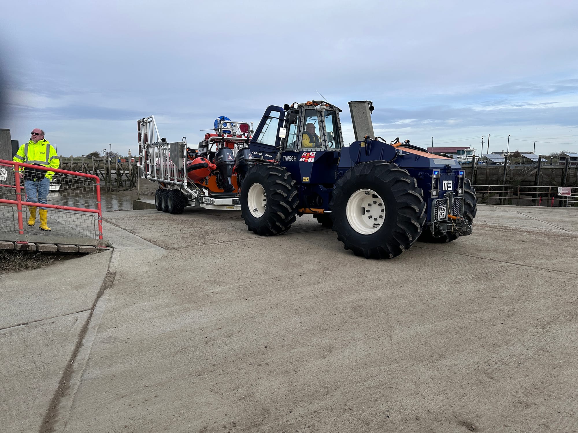 It was low tide so a low-water launch was necessary and the crew set off down through the nature reserve whilst the boat on its carriage was driven down the path adjacent to the river. The River Rother is tidal and at low tide and the hours immediately around it there is not enough water to launch.