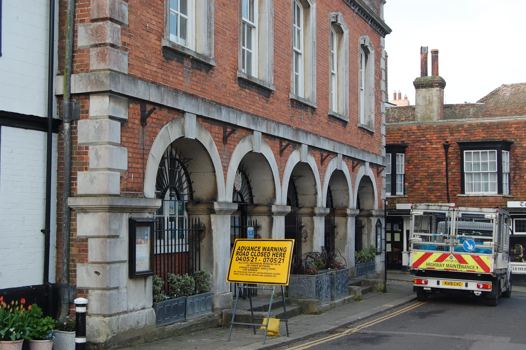 A warning notice outside Rye Town Hall warns that Lion Street will be closed to traffic from May 4 - 7, with East Street and Market Street becoming two way and all parking bays suspended.
