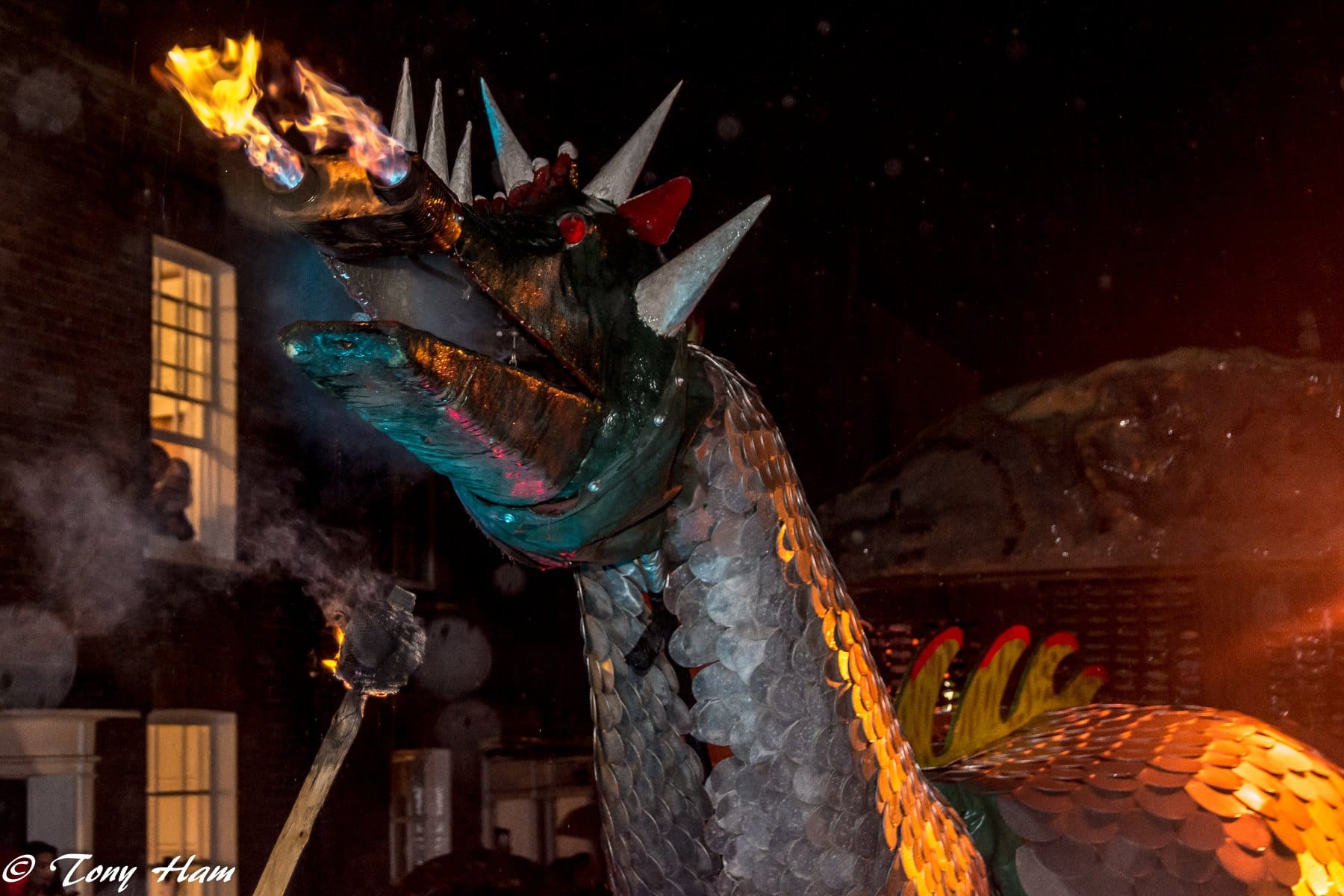 Led by the Rye & District Bonfire Society banner, some 30 visiting societies from all over Sussex processed through the town of Rye with flaming torches, drumming bands, floats and walkers from local groups. Bringing up the rear was our dragon, Scorcher, and our symbol of the society, the burning boat.