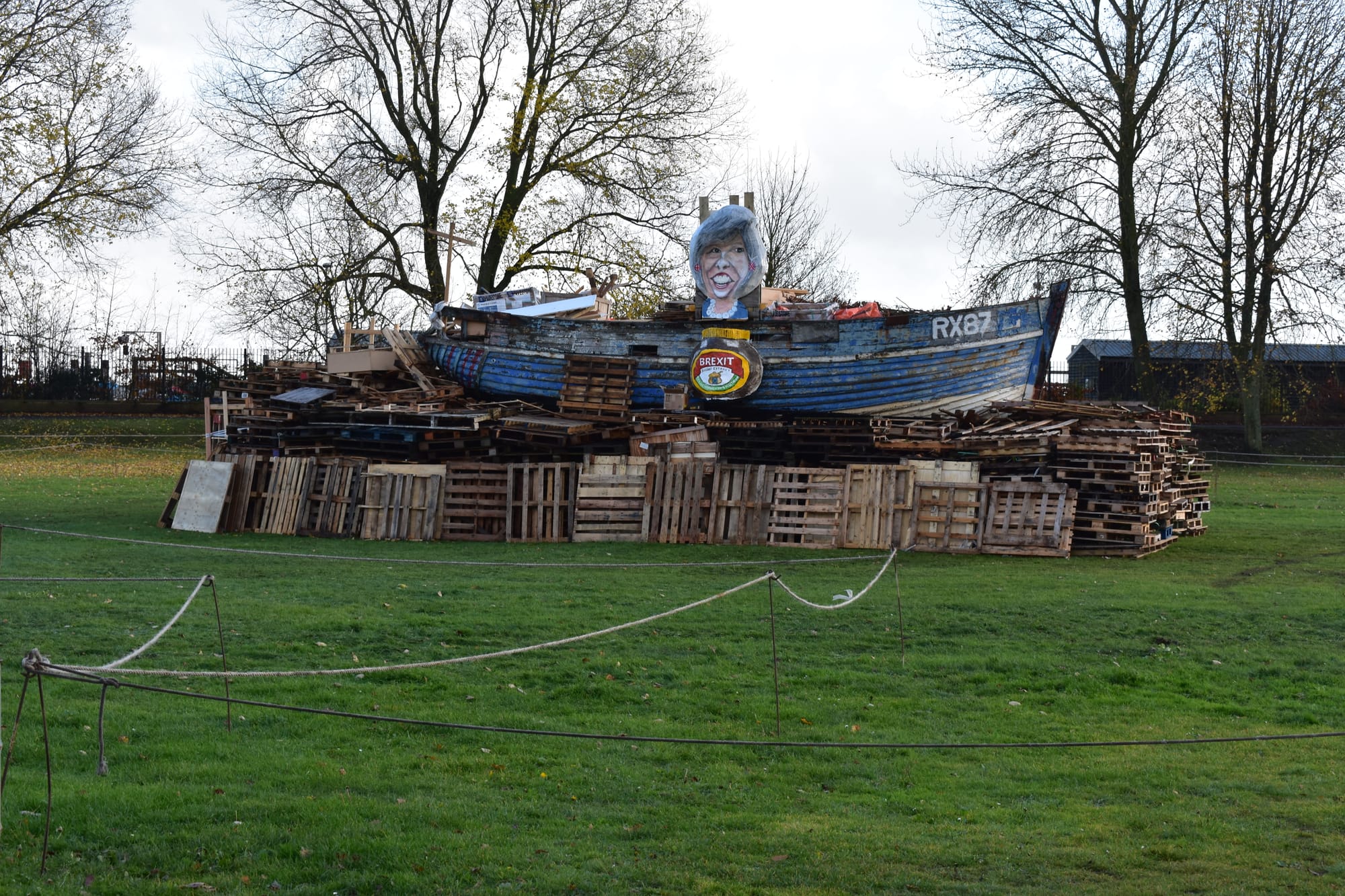 Never afraid of controversy, the Bonfire Boys effigy this year was the Prime Minister atop an outsize Marmite pot (love it, or hate it), relabeled 'Brexit'. An old fishing boat was also being burnt in a hark-back to the days when a burning boat was hauled through the streets before forming the nucleus of the bonfire. This one, however, started and finished its final public appearance as a static part of the fire.