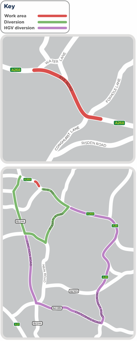 There will be two signed diversions in place – regular traffic will be diverted via the B2244 Junction Road, Main Road and Bodiam Road. HGVs and large vehicles will be diverted via the B2244 Junction Road, the B2089 Chitcombe Road, Northiam Road, and the A28.