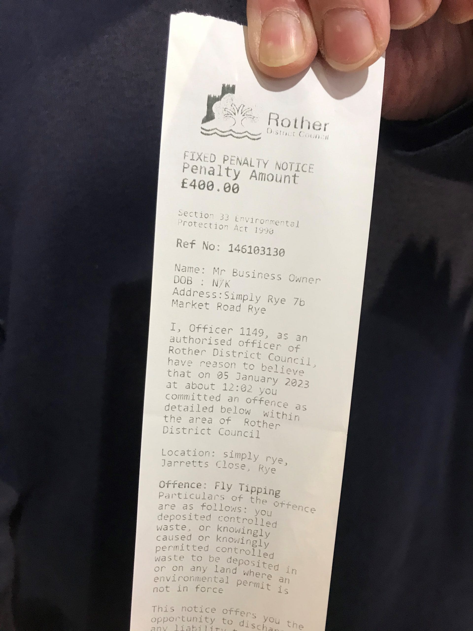 “I’ve just been given a £400 fine for having fly tipped cardboard outside of my shop, Simply Rye in Market Road… the individual who issued the fine works as an environmental officer for Rother. I am absolutely shocked and appalled at what has happened today. What is happening to our town that now has litter wardens and parking enforcement officers out in force on a miserable, wet Thursday in January?. These people swarming our streets giving out fines to local businesses and visitors can only result in the demise of the town. We pay our landlord to rent a shop with outside private space. When we get a delivery of stock we should be fully entitled to empty the boxes on the private land and leave it there for an hour without being confronted by a rude, arrogant litter warden who was not even interested in Ian showing him the evidential paperwork showing how we dispose of our cardboard. At a quiet time of year when profits will be minimal but we continue to trade 6 days a week to help keep the town open and alive, this is a very bitter pill to swallow. To be classed as offenders of 'fly tipping' on private land outside our trading address during trading hours is just taking it all a step too far. I for one am absolutely furious. Fran”
