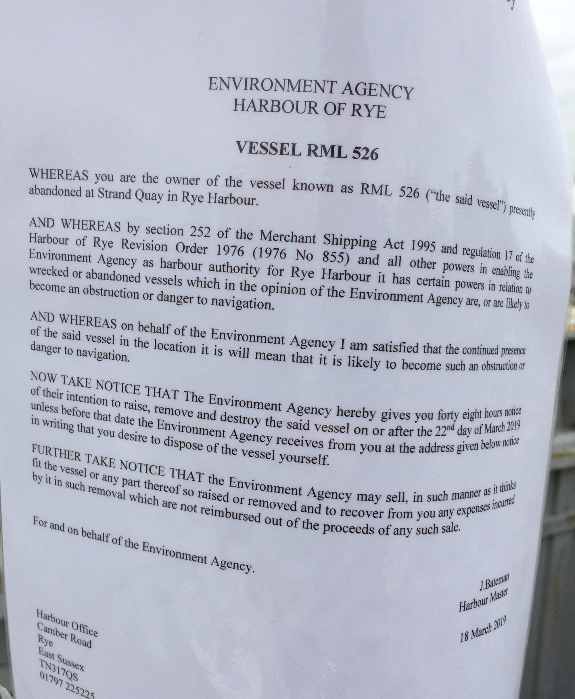 She has lain at moorings for many years, initially undergoing work to restore her to her original WW2 profile. The cost of restoration, however, spiralled beyond even the deep pockets of her owners and for some time she has been abandoned to rot and with harbour dues left unpaid. The Harbour Master, on behalf of the Environment Agency has served notice that unless the owners take action to remove the vessel with 48 hours of March 22 (which they have not done) it will be subject to legal distraint, removed and destroyed as a survey of condition has revealed that the hull is irreparably damaged.