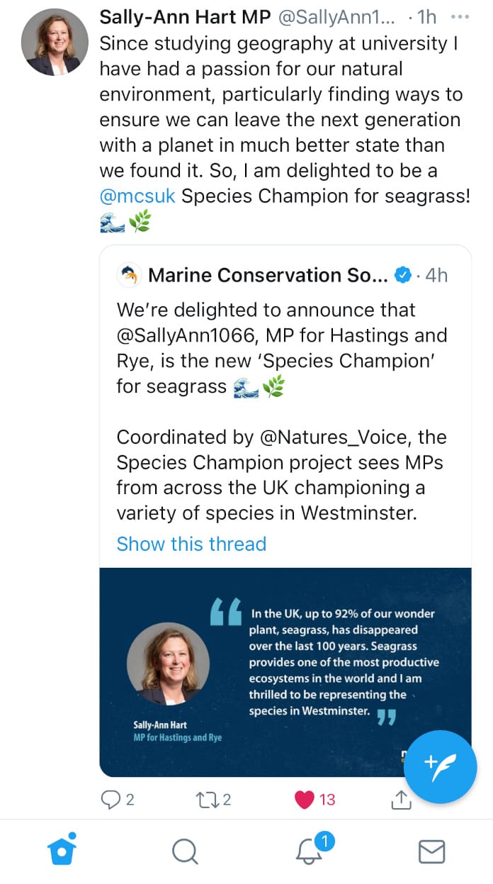 The UK hosts an international conference on climate change (COP 26) this year, and our local MP Sally-Ann Hart has been showing off her green and grassy credentials (see below) by championing seagrass - but local fishermen feel the need for them to be protected too.