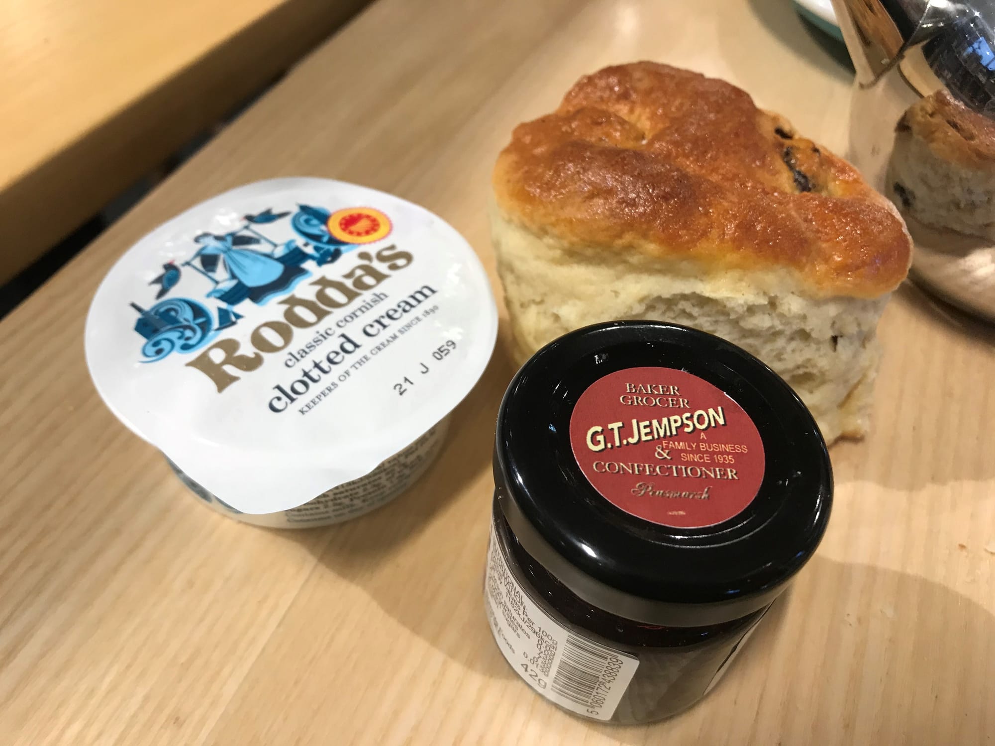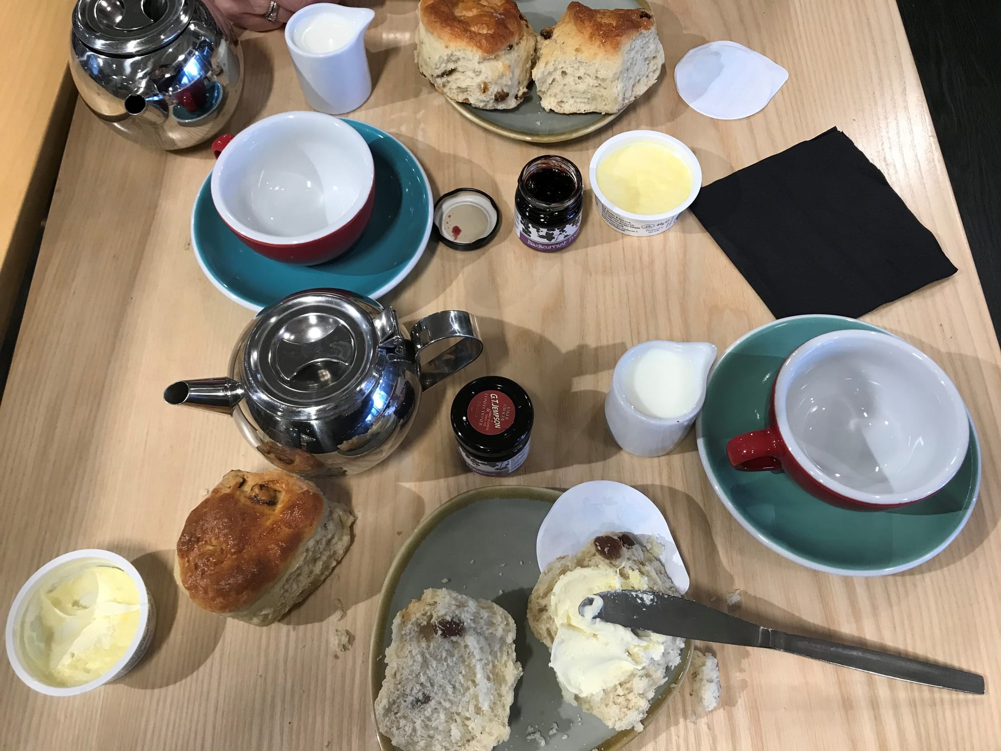 Meanwhile, at the till, the queue of waiting diners was quite slow moving but the ladies behind the counter were doing a sterling job coping with the constant flow of new arrivals. Having been given your order (which you could have had delivered to your table if needed) you took your tray to the tables which were well spaced and arranged for two to four people. The food was fresh, butter was spreadable (not rock hard straight from the freezer) clotted cream and preserves were enough for two large scones and the individual tea pots poured properly and the tea was piping hot.