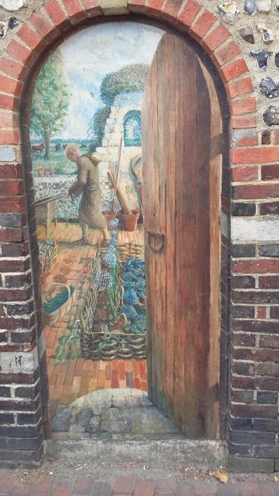 The priory ruins are just a short walk from Lewes train station and we went through the beautiful park, past Southover Grange. Along the way, in fact throughout Lewes, buildings and walls have been partly constructed from the destroyed priory remains. We were given a detailed talk at St John the Baptist Church, Southover, where the remains and tomb slab of the founders of the priory are now laid to rest in the specially constructed Chapter House. It was only by chance, when the railway was built from Brighton to Lewes in 1845, that the lead tomb boxes were uncovered of Gundrada (daughter of William the Conqueror) and her husband William de Varenne. They had the vision and means to construct the priory but did not live to see it completed.