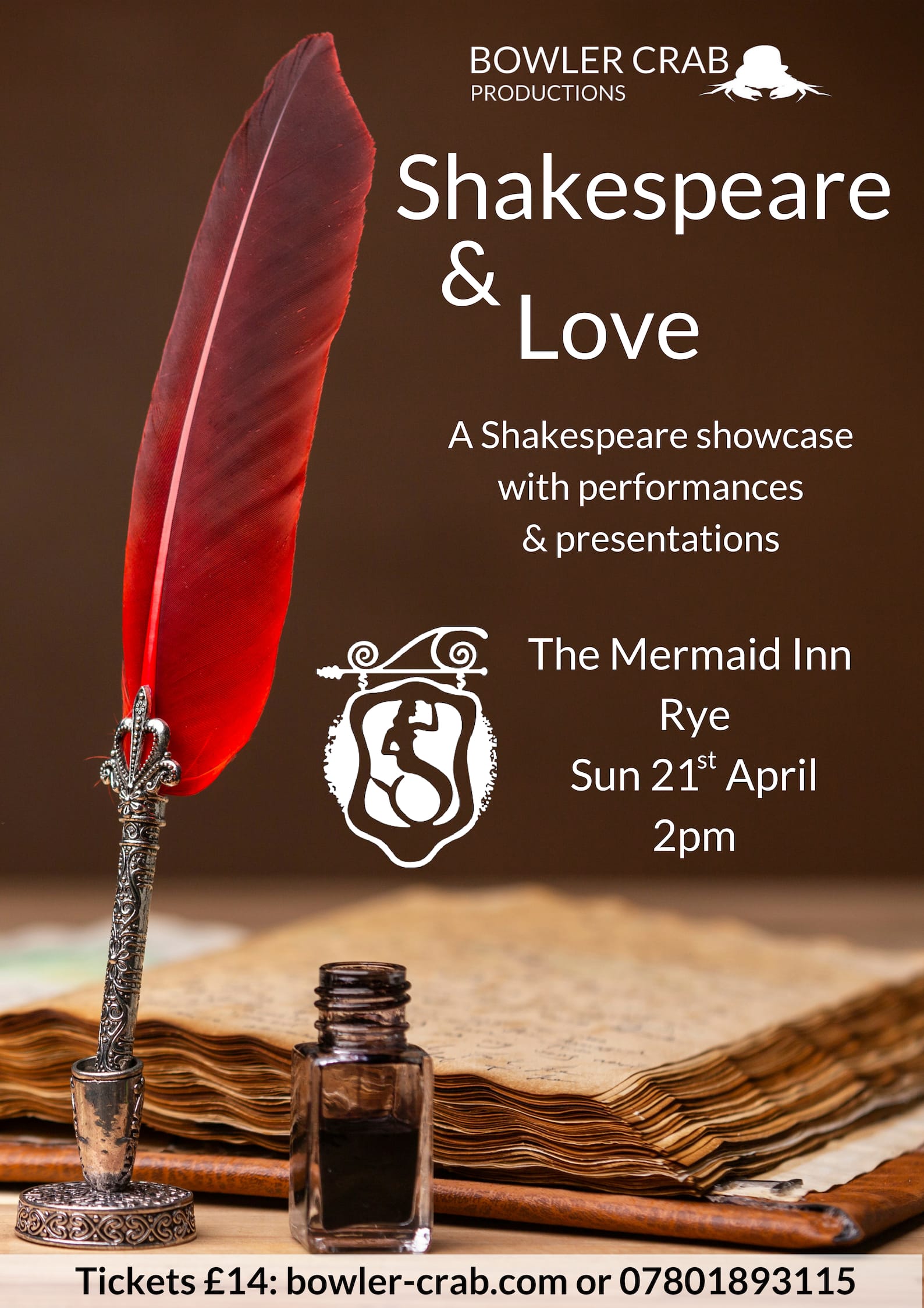 The performance in the Tudor Room will start at 2pm, there will be an interval and it will end at approximately 4:30 pm. Tickets are £14 from www.bowler-crab.com or telephone 07801 893115.