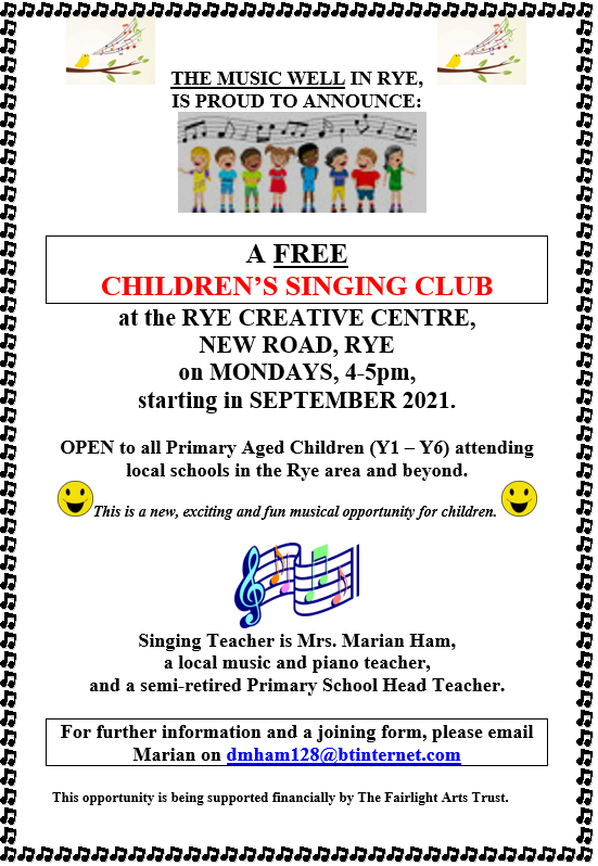 The singing club will take place at the Rye Creative Arts Centre, on Mondays from 4pm - 5pm, and is being offered free to all children for at least one year. The Children's Singing Club is being fully funded by the Fairlight Arts Trust. There is free parking on-site and a café (which is open now!)