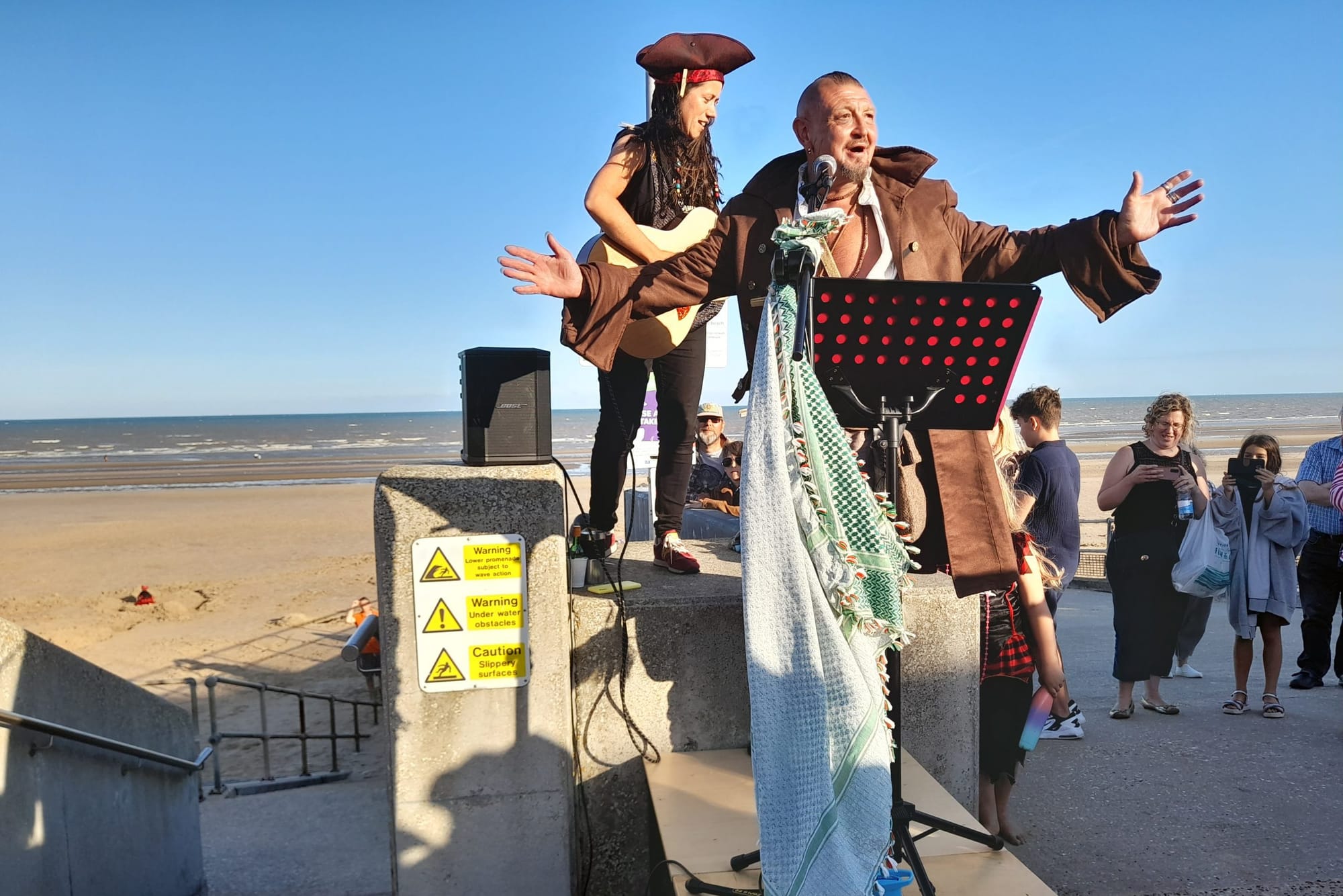 On Saturday, August 27 the Marsh Choir, made up of singers from Rye, Lydd and other parts of the Marsh, were invited to join the Dr Syn Festival in Dymchurch which usually happens every two years but was interrupted by Covid. It started in 2014 as a multi- faceted cultural festival, bringing together the community for music, cinema, theatre and visual arts. Most people stepped up to expectation and had dressed up as pirates/smugglers, a fun and wonderful sight of inspiration, and we were overlooking the sea, the beach and the sun was out.