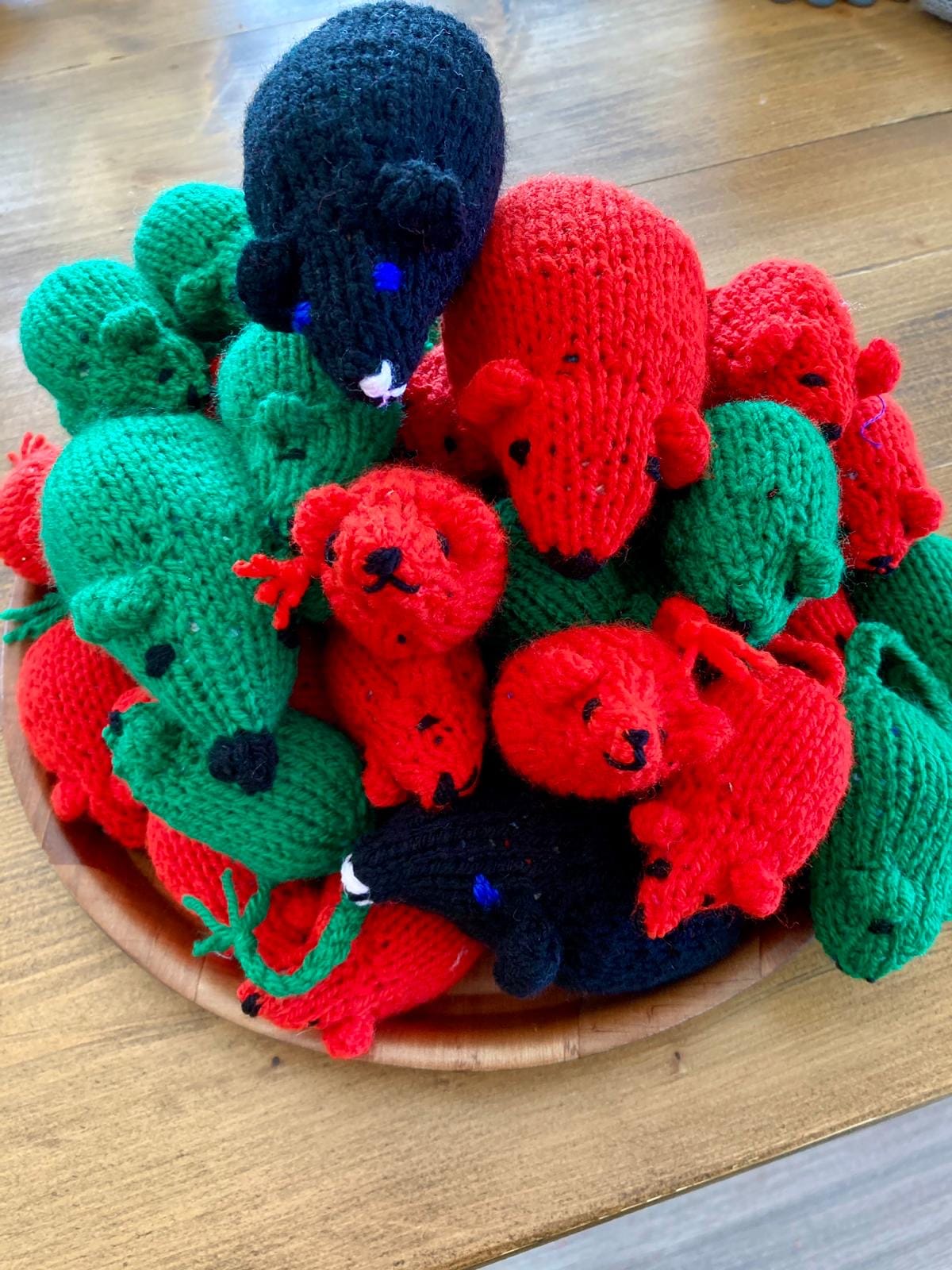 Erica is a Rye treasure. She is so kind and caring and it is no surprise that she was a private nanny for many years. She just loves to knit and enjoys the comradery of the weekly knitting group at the church. She has made mice of all colours and just recently she made green and red ones for Ryebellion drummers to wear on their hats - and even one dragon.
