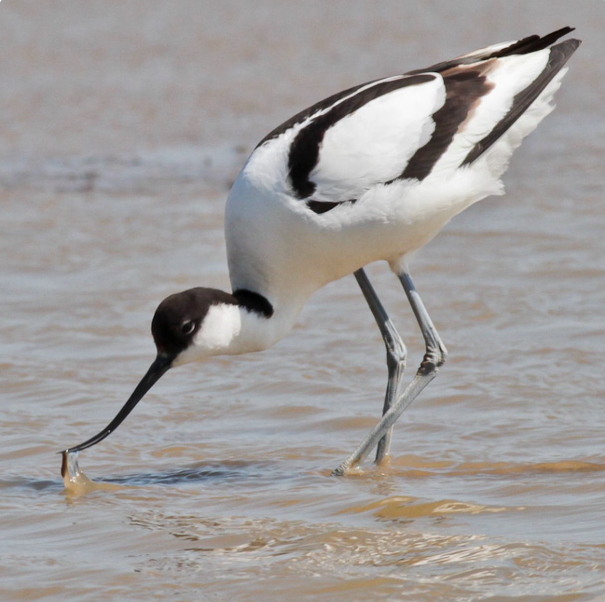 “Mediterranean gulls are similar to black-headed gulls, but their summer hoods are black and they have bright red beaks and legs and their wings are white. Both these gulls feed mainly on earthworms from short grassland that's usually grazed by sheep. Avocets are large black and white waders, with long blue legs and a fine, upturned beak that sweeps through shallow, muddy water to capture tiny shrimps.”