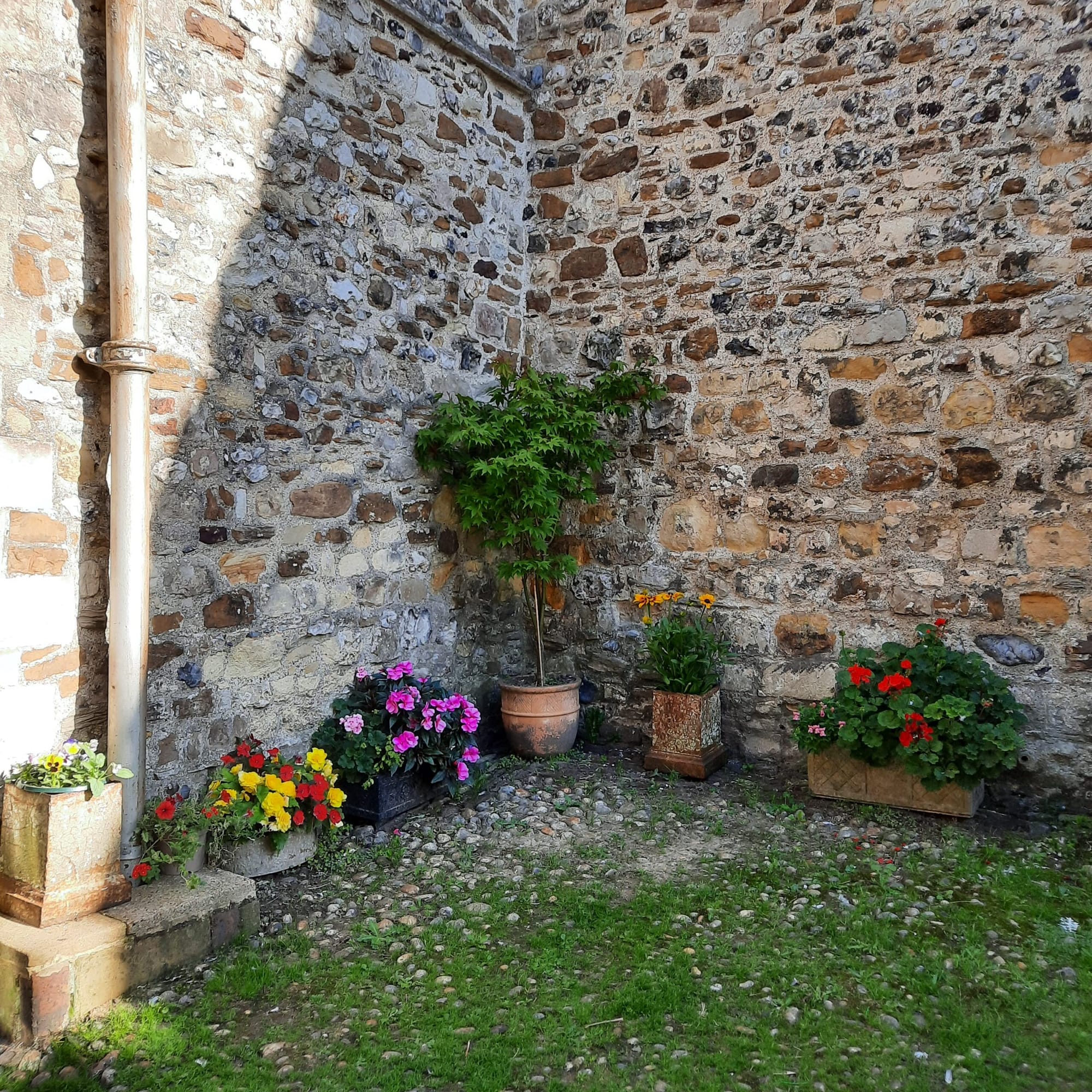 So, if you have visited our church or walked along Church Passage on your way from Layfields to the Mermaid, for instance, you might have noticed pots of flowers blooming joyfully in the shade of the damp green wall, which until recently grew only dog-pee saturated dandelions. This is the handiwork of the blessed ‘Julia of the North Passage’ who alighted from her perch on a corbel high up on the church near the Quarterboys to enliven the area with colourful, vibrant potted blossoms which have changed as the summer season has waned so that there is always a delightful show. Even our war memorial on the other side of the church has benefited from her generous touch, unsolicited and freely bestowed.