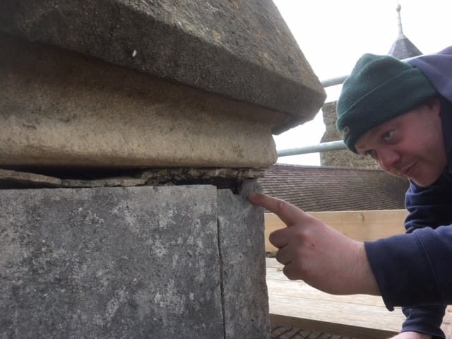 The pinnacle and decorative finial had been installed in Victorian times to surmount a turret over a former internal staircase (now blocked up) that gave access to the clerestory. The ferrous metal rod securing the finial had expanded through rust corrosion and shattered the stone.