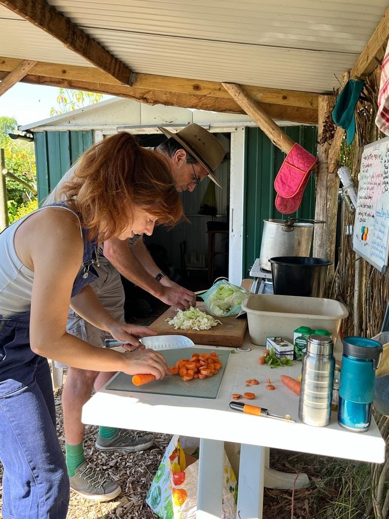 After the regular Saturday morning work session (10am - 12pm), volunteers set about preparing the soup. Attendees brought ingredients from their own gardens or store cupboard including herbs, vegetables, and aromatic pepper. We also used produce from the garden which is currently full of courgettes and tomatoes. We had saved some previously-harvested onions and potatoes for this occasion. Soon, a delicious soup was bubbling away.