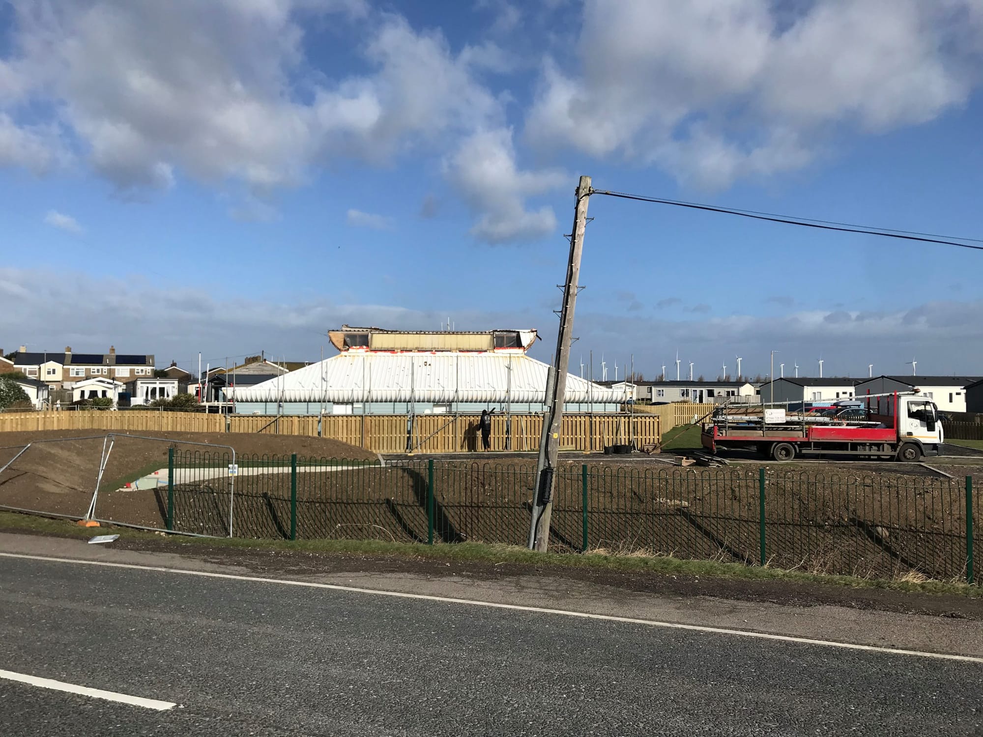 In Camber a Facebook video clip (but beware the language) shows a section of roof being torn off Pontins holiday camp while further along the road, scaffolders arrived at Camber Sands holiday park to build a scaffold tower around one of the main buildings on the campus to allow roofers to repair the damage to the roof ridge which had been torn off.