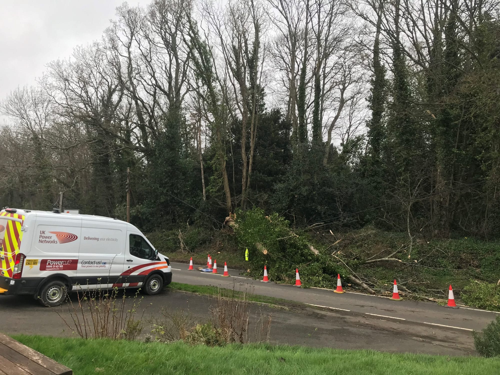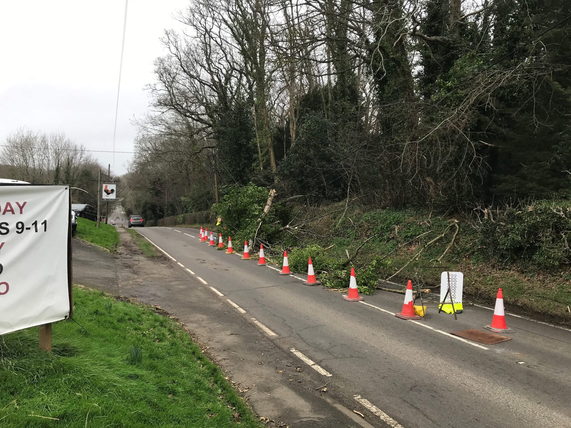 Opposite the Cock Inn a huge tree blocked half of the main road until it was cleared on Monday, and further down main street the community all pitched in together when we tackled a huge fallen tree which had also fallen across the main road - see the main photo. The police officer at the scene worked tirelessly to saw the branches off, helped by a community of locals and passing motorists until a tree surgeon arrived and towed the main trunk to the pavement before returning to cut it up later.