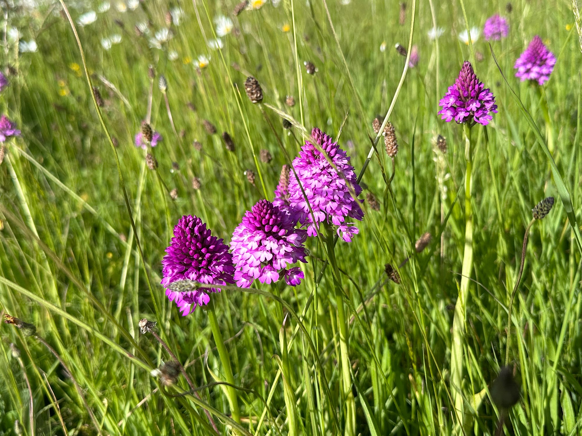 The churchyard at Rye Harbour church is full of daisies and dotted among them are really beautiful pyramidal orchids (the pyramidal orchid displays bright pink flowers in a dense, pyramid-shaped cluster at the top of its stem; it has long, narrow and pointed leaves).