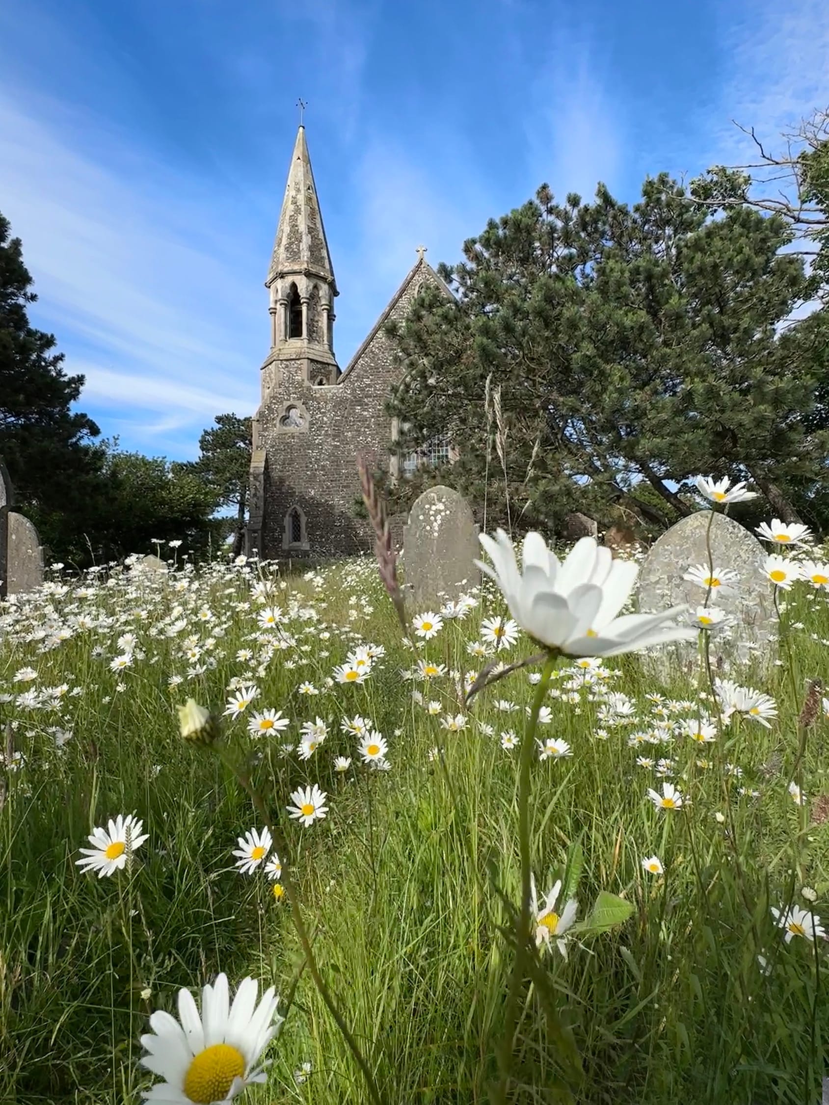 The churchyard at Rye Harbour church is full of daisies and dotted among them are really beautiful pyramidal orchids (the pyramidal orchid displays bright pink flowers in a dense, pyramid-shaped cluster at the top of its stem; it has long, narrow and pointed leaves).