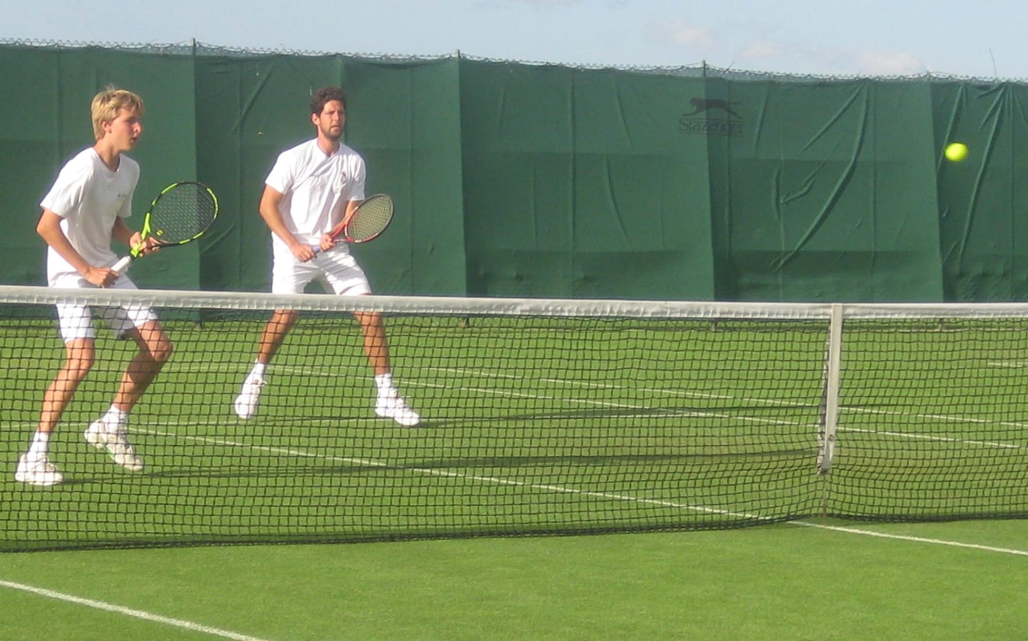 Friday’s singles saw some closely contested matches, which came to an abrupt halt in the late afternoon as a ferocious squall rolled in from the Marsh, sending the players scuttling for shelter. Tested by blustery conditions on Saturday, the contestants nevertheless all rose to the challenge with some fast and furious doubles. Strong winds and lashing rain brought a washout to Sunday, with no play on the grass, but the bulldog spirit prevailed. A number of stalwarts faced up to the weather and took to the hard courts, while others honed their skills at table tennis in the clubhouse and the rest tested their vocal cords as RLTC member Reg Marchant swapped racket for guitar and led a singalong with fellow member Kate Menzies in the marquee. Then happily, at 10:30 on Monday morning, the skies cleared and thanks to the impeccable preparation of the grass the players were soon able to take to the courts again.