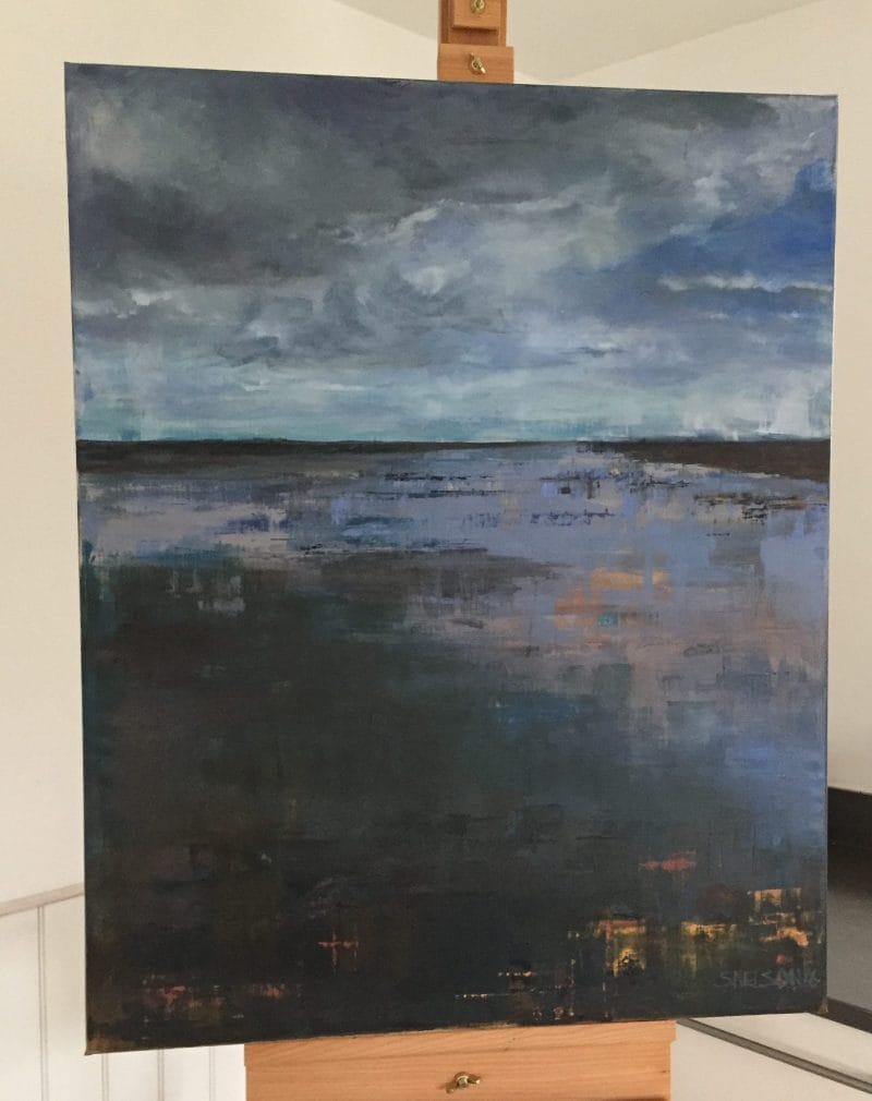 Encouraged by the results of High Water, I have since painted a few figurative works and am now stretching up canvases ready for more landscapes. The down side to painting is all the kit that goes with it. Easels, canvases and bags of paint paraphernalia are now distributed throughout our little house and oily turpentine scents the air, but I am smitten and now reconnected with painting, starting to think that I might need a studio too…. ooh and maybe a gallery to hang all the results?