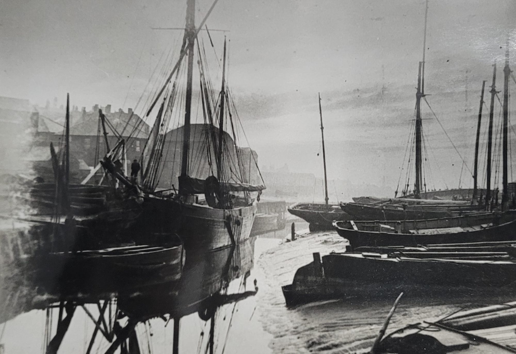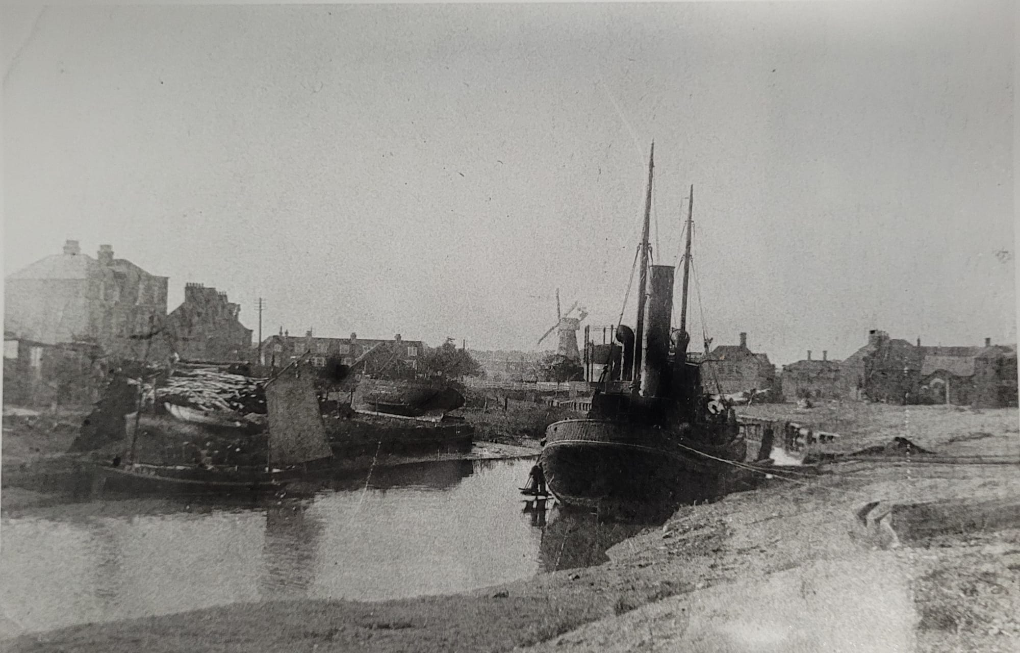 In the background is the Tillingham bridge over the river with the windmill and gasworks which had been producing coal gas since the 1830s. The crane on the quay was used to set masts into boats and to load and unload. On the left bank is a the shipbuilding yard of Hoads who built sailing and steam fishing and trading boats.