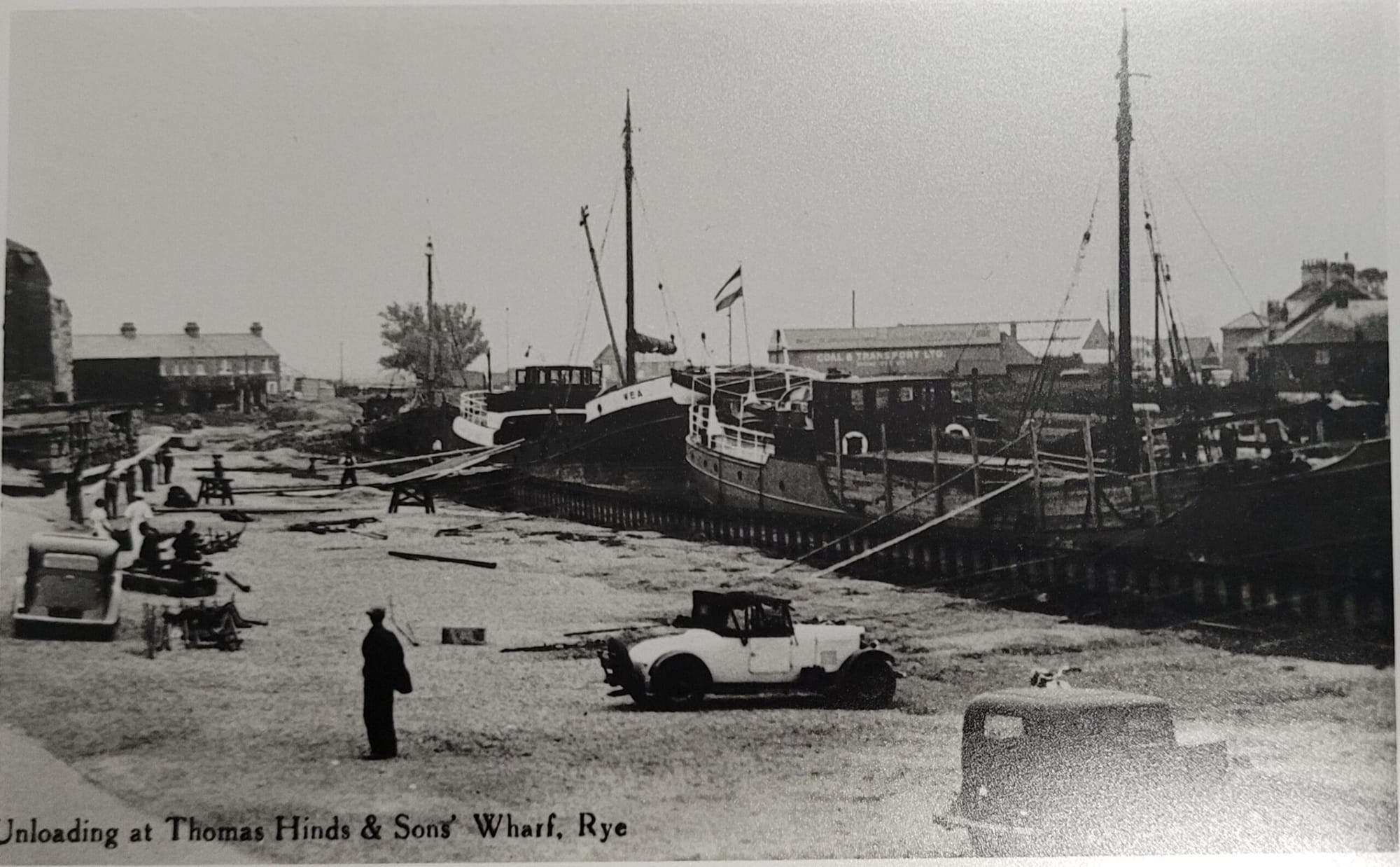 The Mountsfield, a ketch coaster built in 1910 by G & T Smith moored near the Tillingham bridge. In the background, behind the ship, Thomas Hinds and Sons timber yard can be seen on the right and next to it, the striped building, is the Rye Customs House built in 1855 which then became the coal office in the mid 1920s.