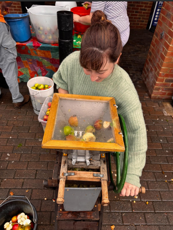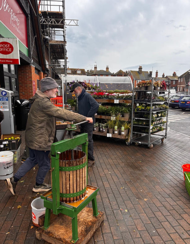 Despite the intermittent rain, a dedicated team of volunteers from the Rye Community Food and Wildlife Garden (RCG) set up a demonstration of old-fashioned apple pressing at the entrance to Jempson’s in Rye on Saturday September 20 from 10 am to 12 pm, much to the delight of shoppers, residents, and visitors. This is the third year that the RCG has held this annual outreach event at Jempson’s, with much appreciation for their support and for the visibility and footfall that the location provides.