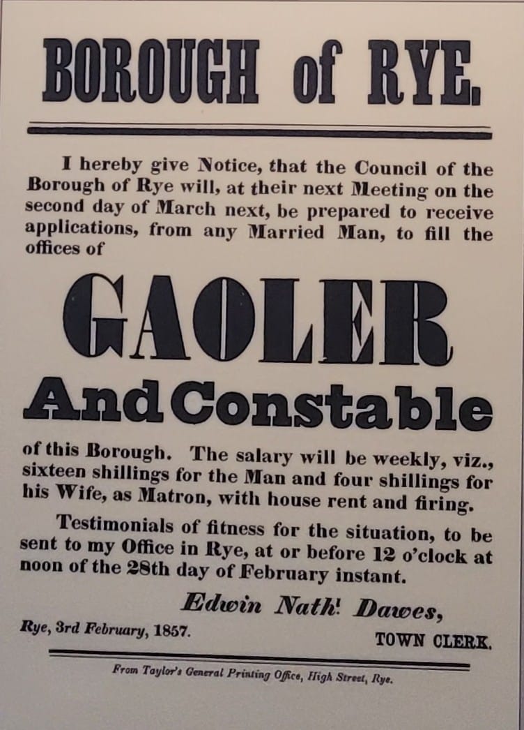 In Rye, the castle acted as a town gaol from the 15th century and imprisoned beggars, debtors, vagrants, thieves, army deserters, men pressed for the army or navy, and those awaiting execution or other punishments such as whipping, fining or transportation to the colonies. In 1865 it became a lock-up for the Rye police before the purpose built police station was built in Church Square.