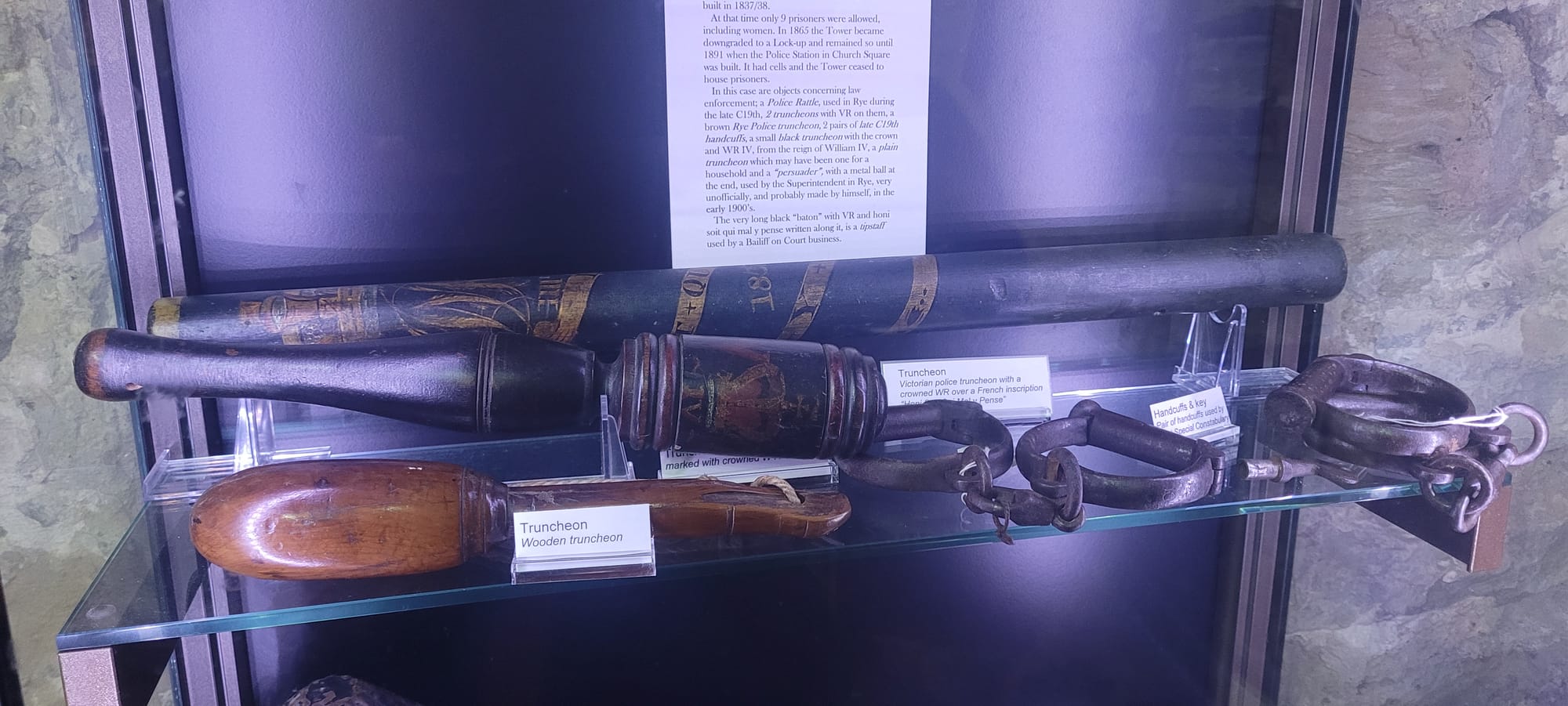 Truncheons have been carried by watchmen, parish constables and subsequently policemen since the Middle Ages, used both for defence and as symbols of authority. They were often painted with crown and royal cypher or arms and were used as officer warrants bestowing them with the authority to carry out their duty. The Rye Borough police truncheon in the Ypres tower of Rye Castle museum, is Victorian, painted with a crown and 'RP' for Rye police. Painted truncheons were phased out from the 1870s and 1880s.