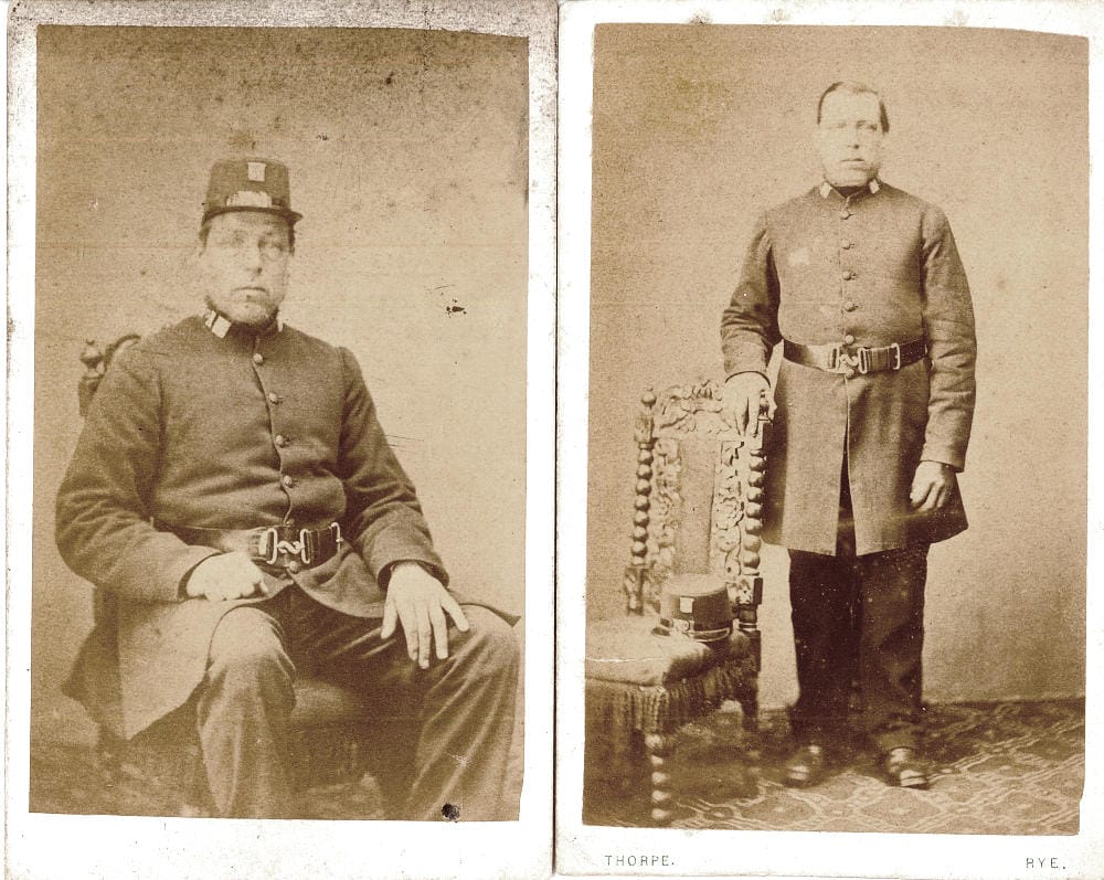 Rye had its own borough police force from 1838 to 1889 made up of just two officers. Their most challenging duties was policing the annual bonfire night when the bonfire boys frequently caused trouble requiring the extra assistance of special constables. In 1875 the head constable, Parker Butcher, tried to stop the procession but was thrown into a burning boat and had to be rescued. The following year, in 1876, over 20 special constables were given the job of protecting private property from fire, rather than stopping the procession. Further trouble occurred in 1884 when Superintendent Bourne and PC Henley, along with a force of specials, prevented the crowd from taking a boat from the Rock Channel shipyard of G&T Smith’s. However, in the course of their duty, Bourne was knocked out and PC Henley’s helmet was battered.